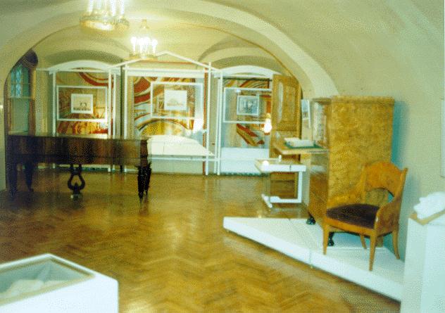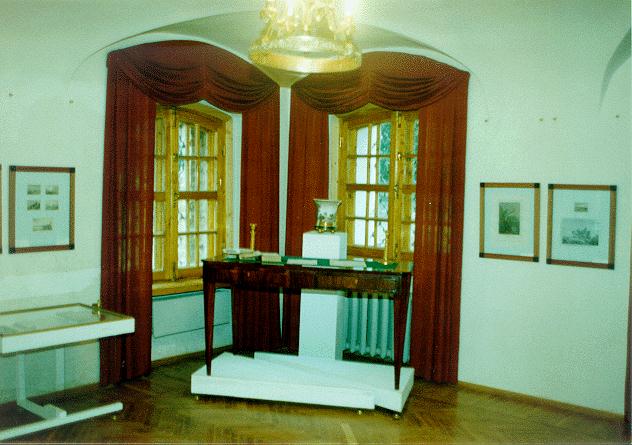Первый этаж в южной части здания был, видимо, хозяйственным. На второй, этаж ведут две служебные лестницы у торцовых фасадов. Главная лестница, также не очень широкая, поднимается в центре дворового фасада вокруг небольшого, почти квадратного вестибюля. Более обширный вестибюль с перспективными обрамлениями проемов прилегает к парковому фасаду.