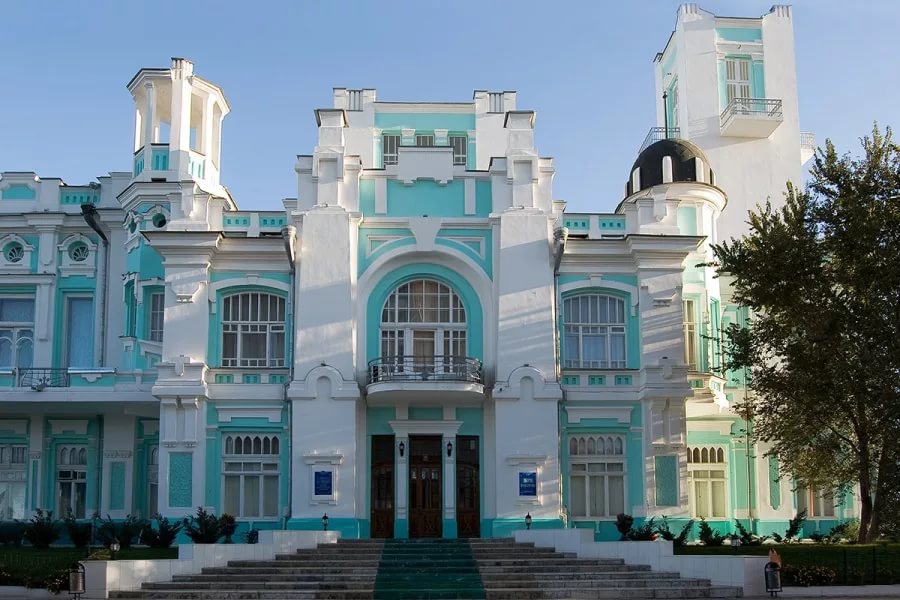 Здание торгово-промышленной биржи сооружено в 1910г. на месте существовавшей деревянной постройки того же назначения. Постройка нового монументального здания Биржи с обширным залом для купечества диктовалось ростом торговых связей и все более крепким экономическим могуществом юга России. Прежде, в 1918- 1920гг. в здании размещался политотдел Волжско-Каспийской военной флотилии. В здании неоднократно выступал С.М. Киров, являющейся членом политотдела флотилии.