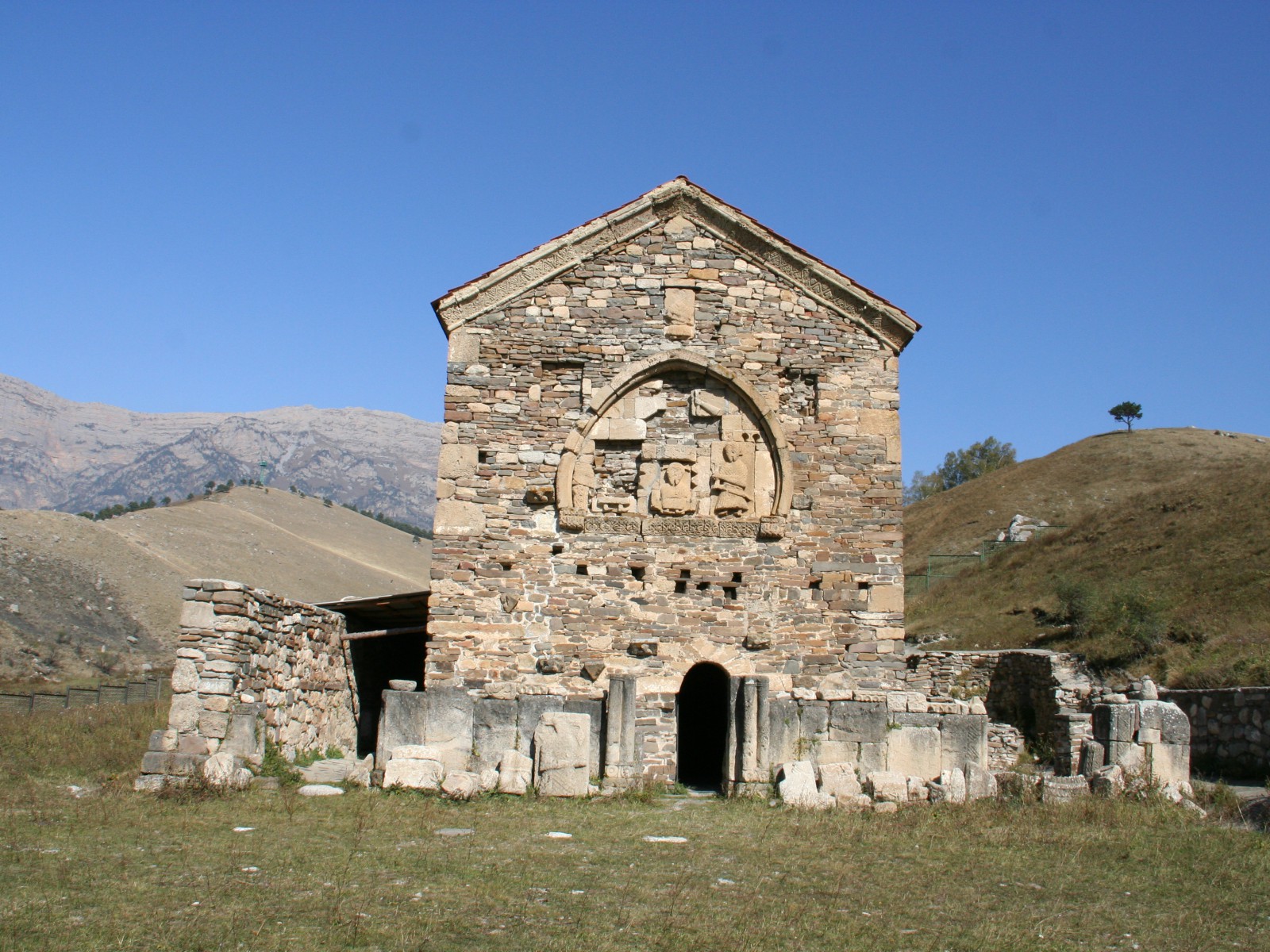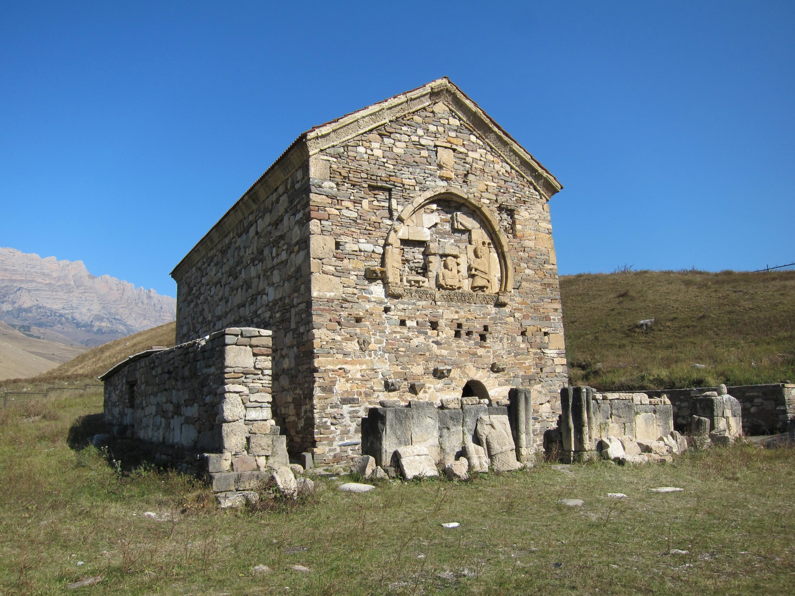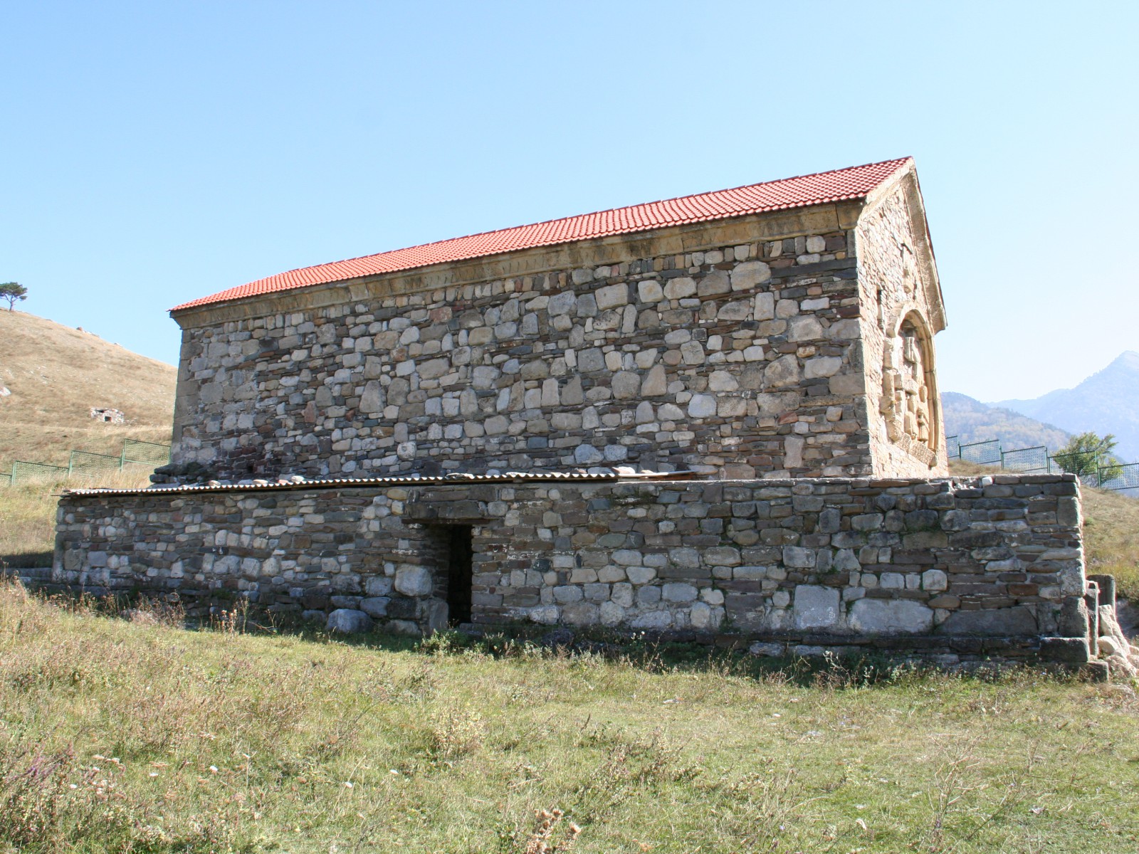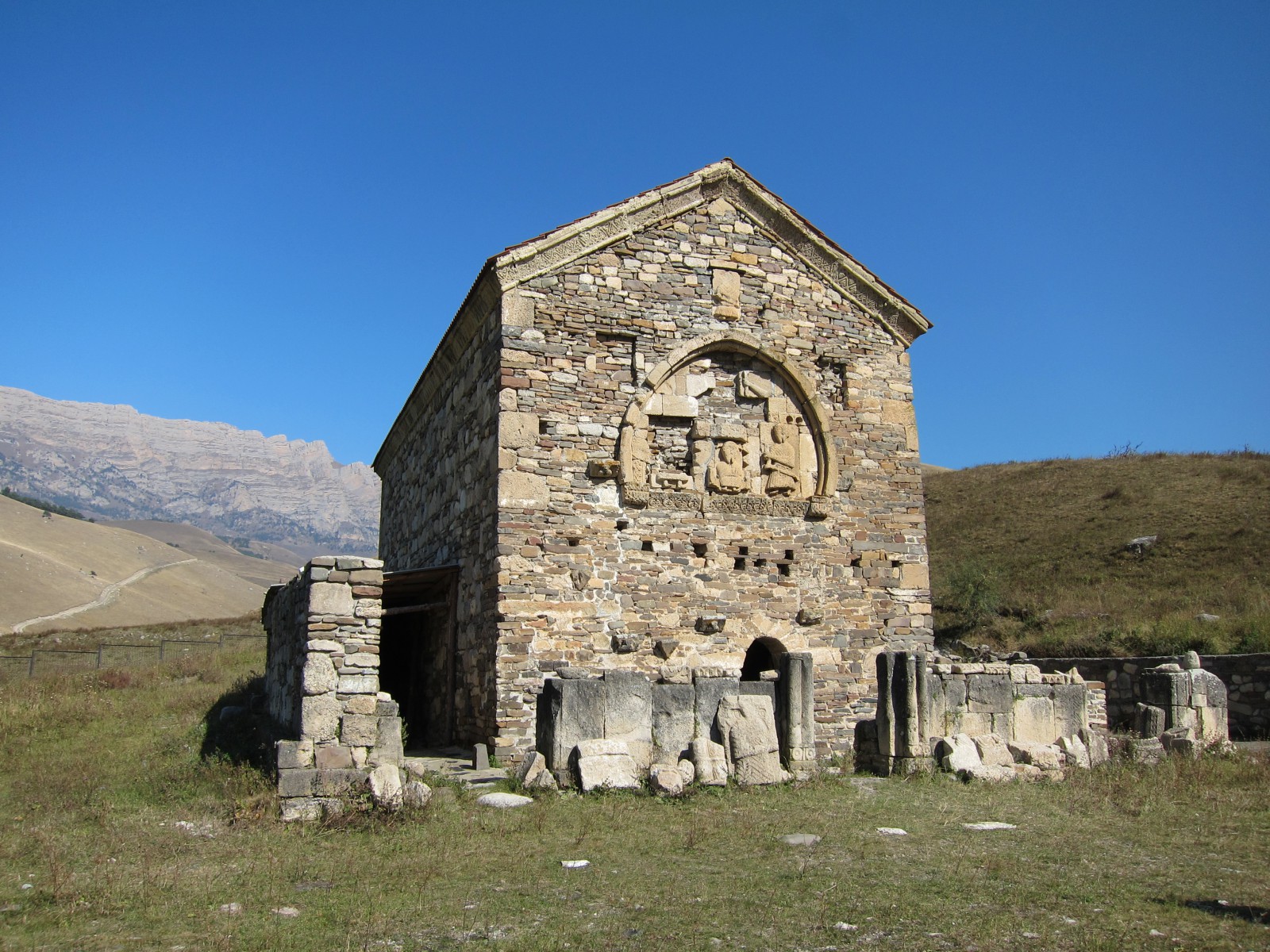 Храм имел и каменную ограду с воротами. Последние венчались полуциркульной аркой, облицованной плитами с резным орнаментом. Время сильно разрушило изображения на барельефах, орнамент на облицовочных плитах, а также плиты с грузинскими надписями. Не осталось следов от фресок, выполненных на бледно-розовой облицовке и покрывавших внутреннюю поверхность стен храма.