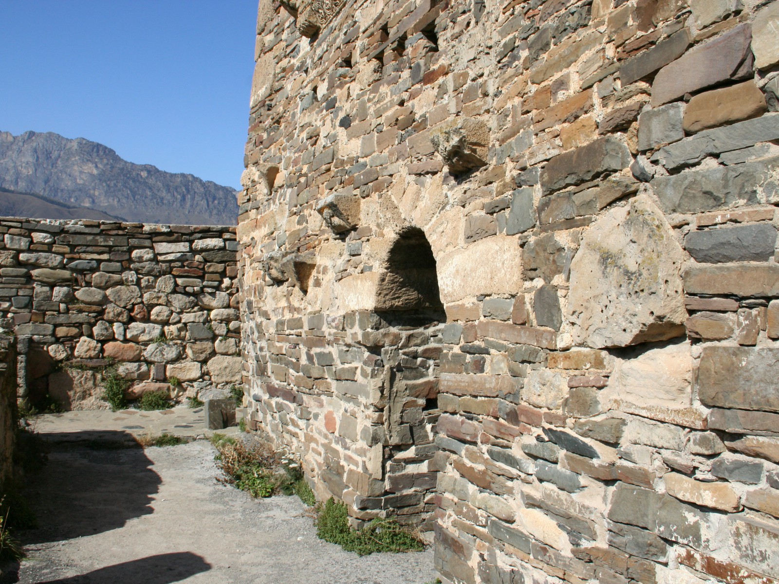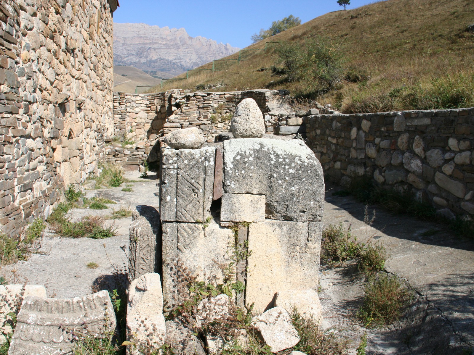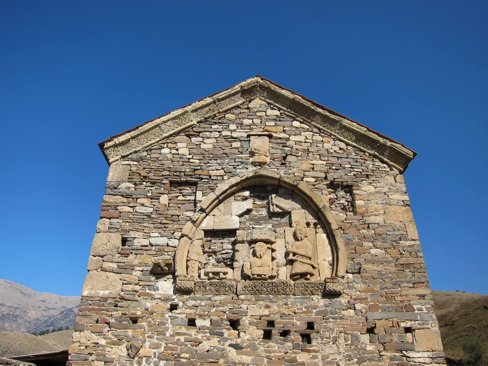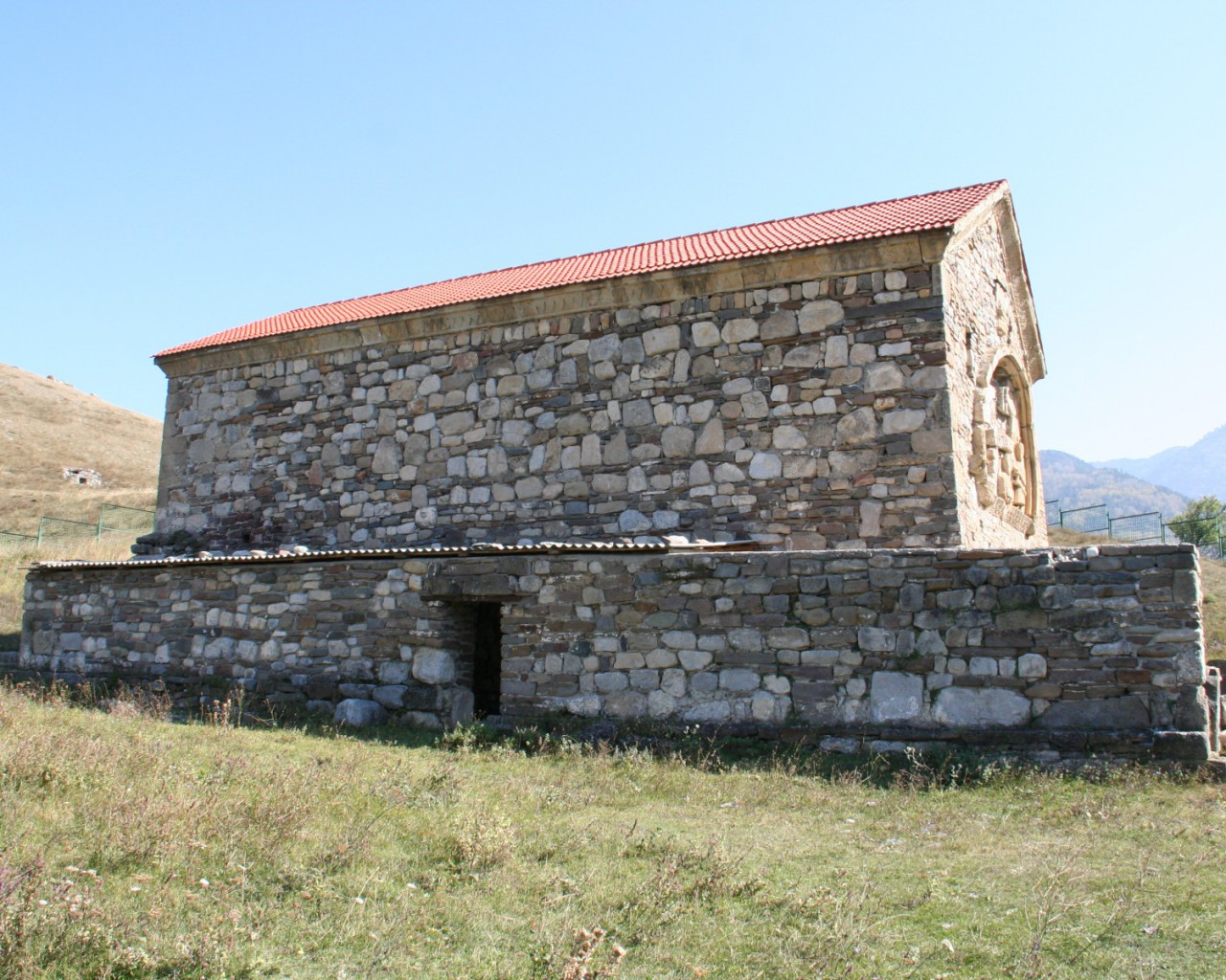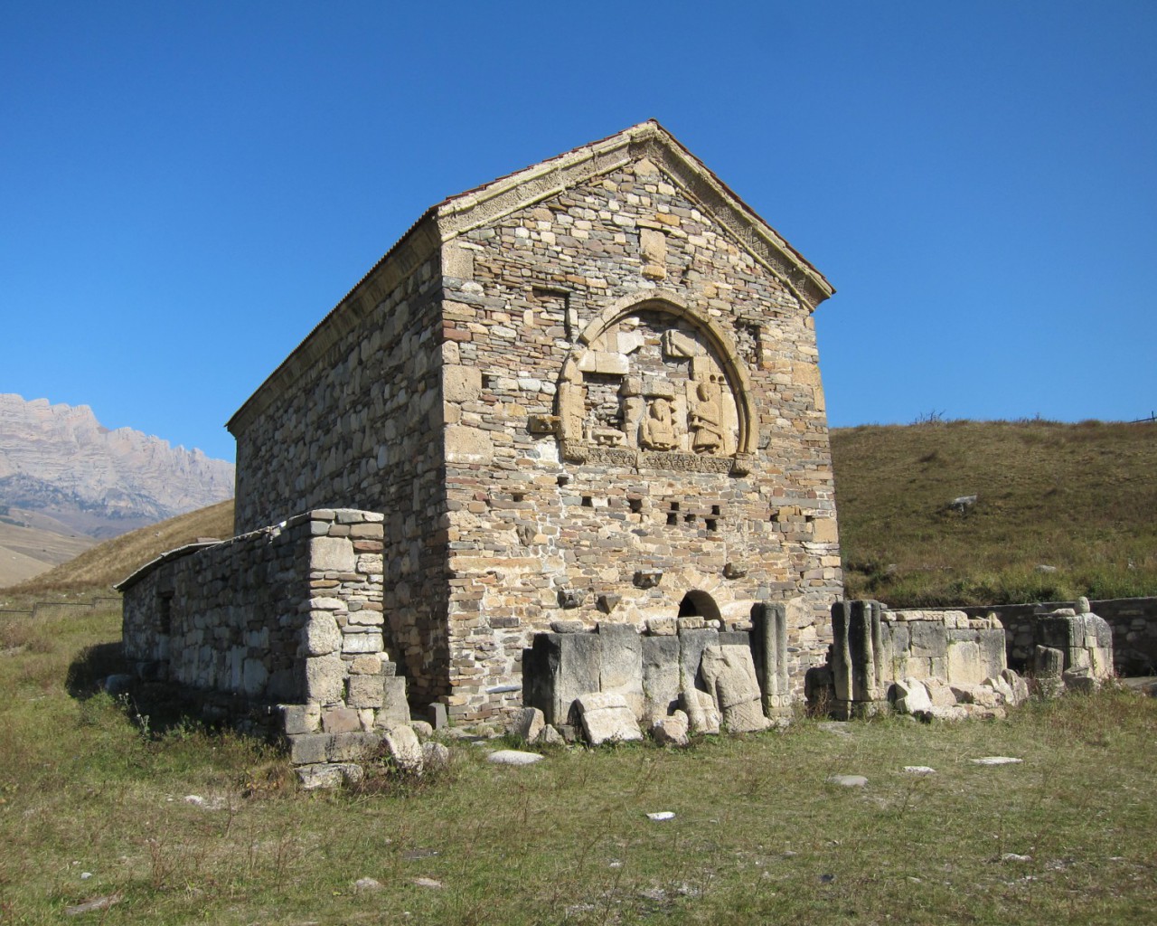 Храм имел и каменную ограду с воротами. Последние венчались полуциркульной аркой, облицованной плитами с резным орнаментом. Время сильно разрушило изображения на барельефах, орнамент на облицовочных плитах, а также плиты с грузинскими надписями. Не осталось следов от фресок, выполненных на бледно-розовой облицовке и покрывавших внутреннюю поверхность стен храма.