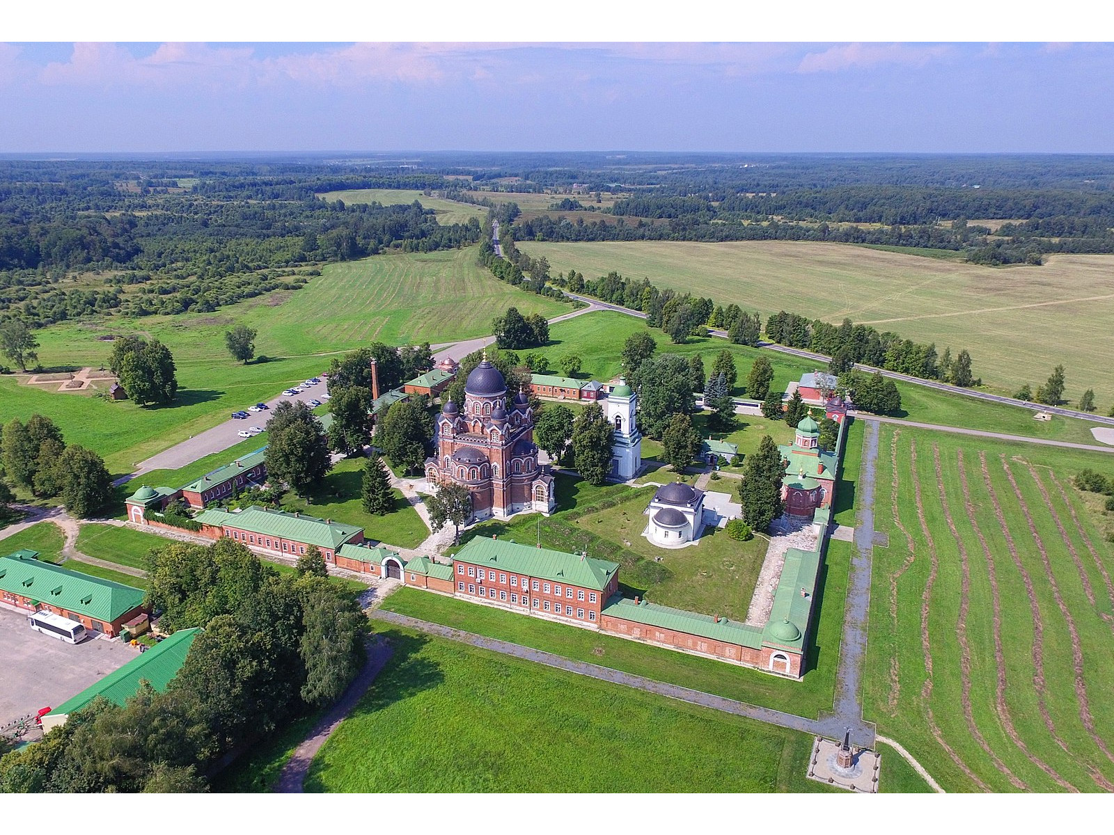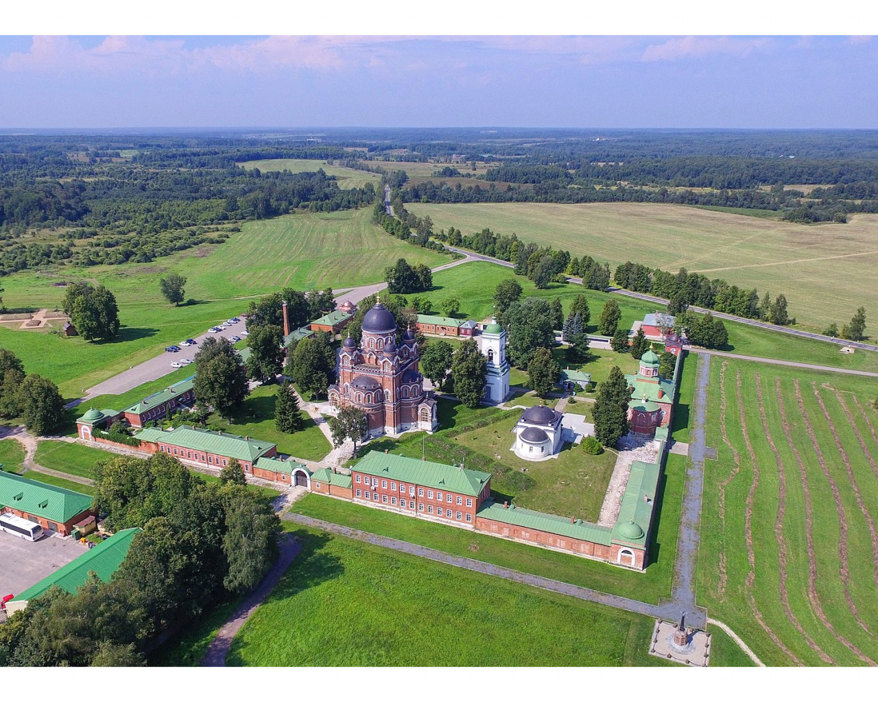 Основные цвета в монастыре — красный и зеленый. Из красного кирпича выстроена у северной стены церковь Усекновения главы св. Иоанна Предтечи, крепостная ограда, вдоль которой разместились келейные корпуса и музейные экспозиции… Из красного кирпича сложен величественный храм в честь Владимирской иконы, увенчанный пятью зелеными куполами. Красно-зеленый цвет выбран неслучайно. Русское воинство, еще со времен императора Петра I, облачилось в форму красно-зеленого цвета.