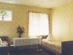 Деревянный домик, двух, трех, четырех местные номера с общим коридором, в котором находится холодильник. В номере: металлические кровати с панцирной сеткой, стол, стулья, туалет находится в отдельно стоящем здании, умывальник расположен с боковой стороны домика.