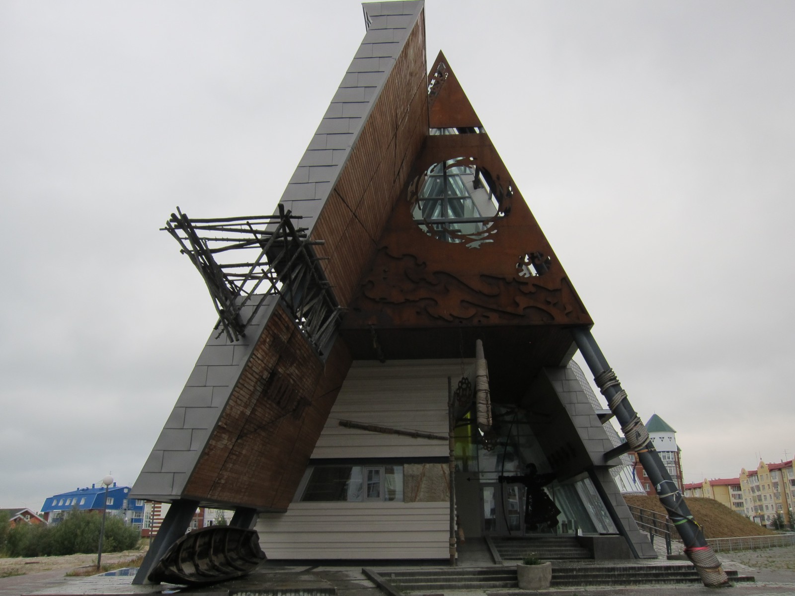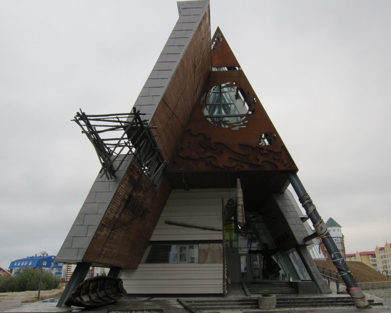 В основе архитектурного решения присутствуют два основных символа, связанных с жизнью коренных жителей, – чум и лодка. Конический часть здания – прообраз традиционного жилища северных народов – чума. Прообразом горизонтальной части здания является длинная и узкая лодка – облас, используемая коренным населением для рыболовства и передвижения по рекам и озерам.