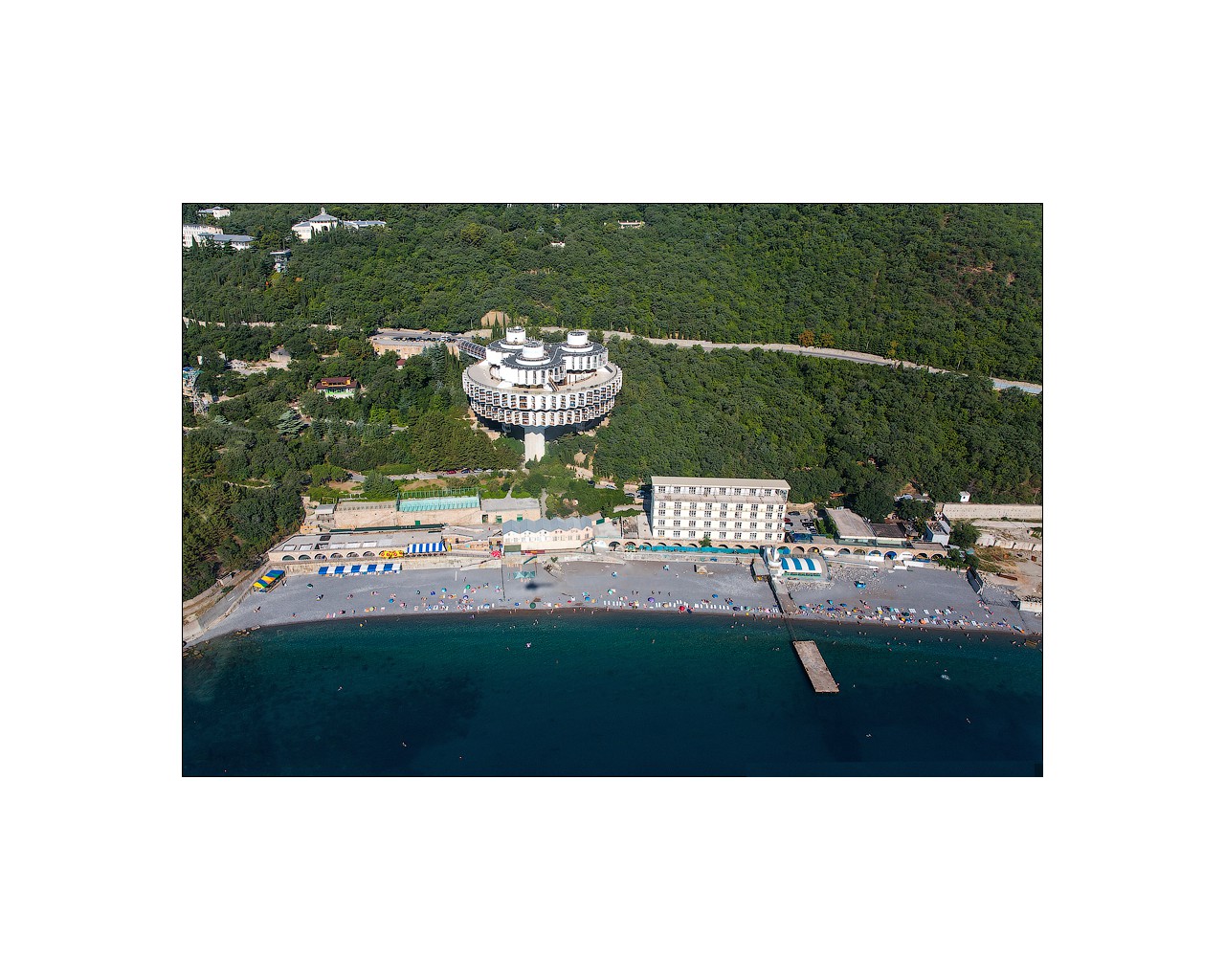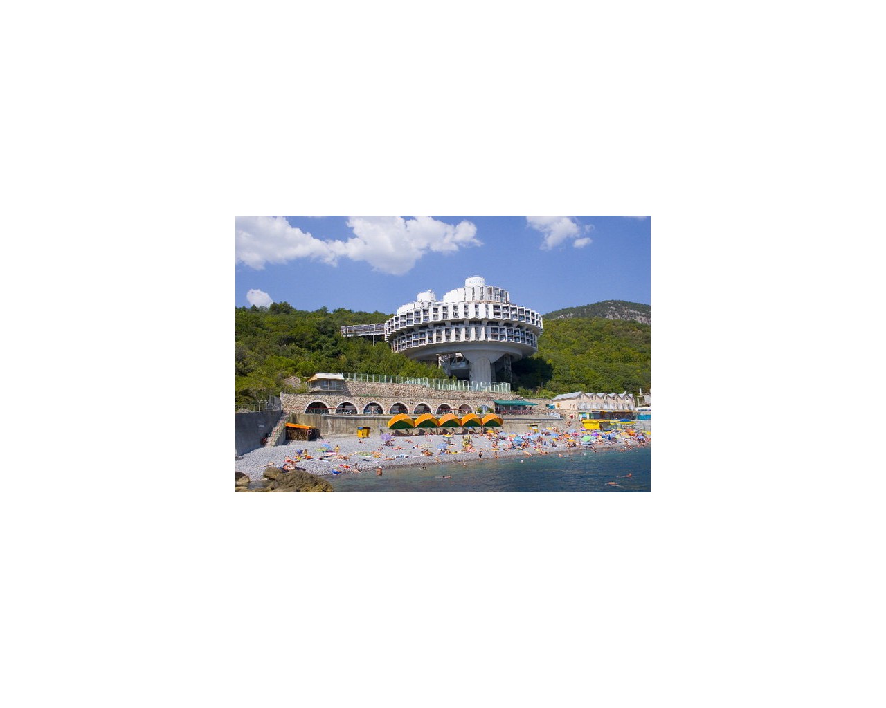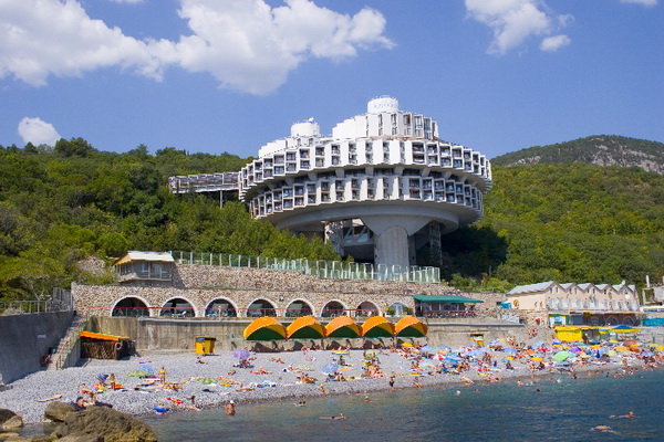 Основной корпус - "Дружба" - по своим объемно-планировочным и конструктивным решениям не имеет аналогов и является уникальным. Форма зданий позволяет расширить границу обзора; из окон открывается прекрасный вид на морские просторы и неповторимый крымский ландшафт. Здание "Дружбы" построено по оригинальному проекту в форме кольца, установлено на трех высоких башнях-опорах, в которых размещены лифты, лестницы, коммуникации. На нижнем уровне здания находится бассейн с морской водой, широкие окна которого создают иллюзию открытого моря.