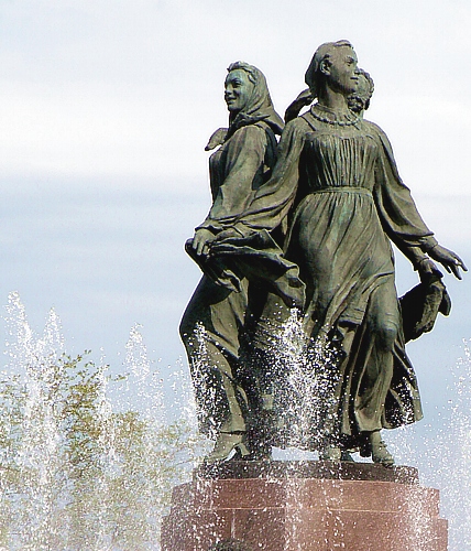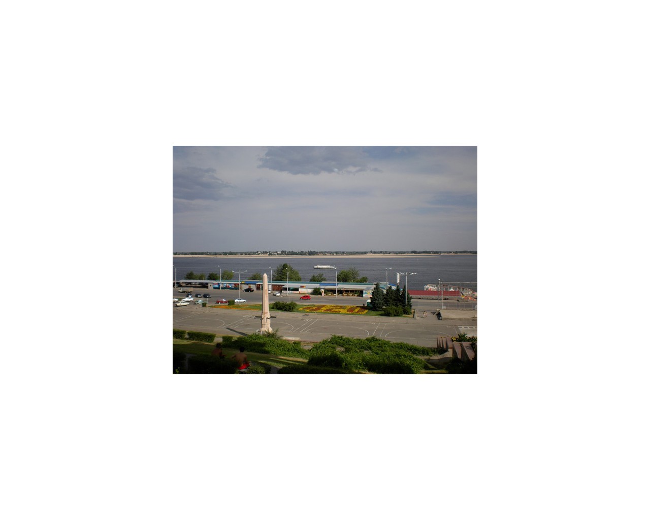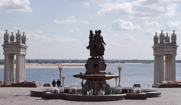 Именно с этого места, от фонтана, к которому спускается пешеходная улица Аллея Героев, следует начинать прогулку по набережной. При выходе с Аллеи на набережную перед взором все больше и больше раскрывается с севера на юг Великая Волга, несущая спокойные темные воды свои в Каспийское море.