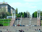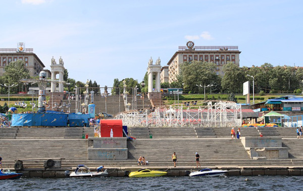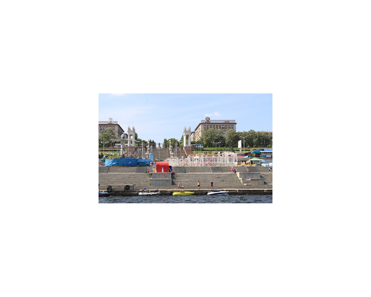 Центральная лестница. Спускаясь от фонтана к Волге вы попадаете в так называемую развлекательную часть набережной. От пропилей к самой кромке воды ведут 100 гранитных ступеней. Уровень воды в Волге весной сильно поднимается, к лету опускается, поэтому количество ступеней может быть разным. По обеим сторонам от лестницы на пригорках расстилается зеленый газон с несколькими дорожками. Если найдете свободную лавочку (что редкость), рекомендуем просто посидеть, полюбоваться Волгой. Ступени лестницы и газоны служат как в амфитеатре зрительскими местами, если на набережной проводится концерт: внизу расположена сцена. За сценой через дорогу несколько аттракционов и каруселей, тир и кафешки.