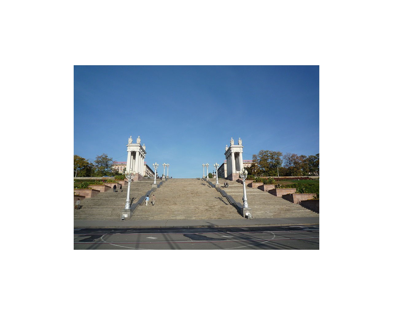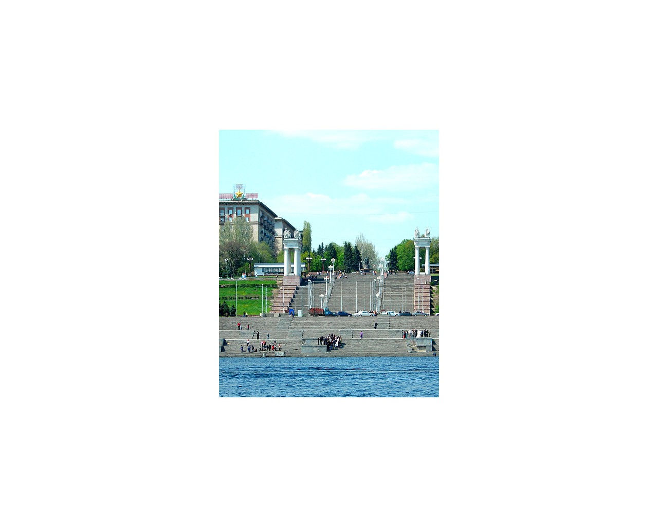 "Плывут теплоходы - привет товарищу Сталину!" - под таким девизом должна была жить центральная набережная Сталинграда, но эпоха Сталина уже успела закончиться к моменту сдачи объекта. Набережная отстроена в стиле советского классицизма по проекту архитекторов Симбирцева, Фиалко и Макаренко к 1952 году. Белоснежные пропилеи по обеим сторонам лестницы - как ворота в город на Волге. К пропилеям ведут 100 ступеней от самой кромки воды. Набережная получила название имени 62-ой Армии, защищавшей северную часть города во время Сталинградской битвы. Именно напротив центральной лестницы располагалась в те годы основная переправа через Волгу.