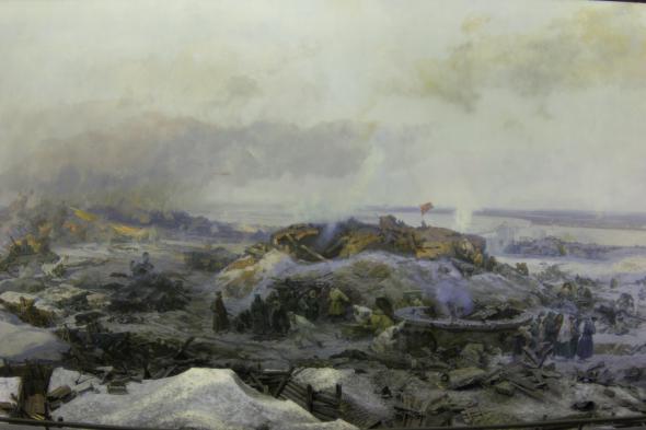 Однако создание другого объекта музея, панорамы сражающегося Сталинграда, началось задолго до строительства самого здания. В 1948 году начались работы над созданием эскиза полотна. Кропотливую работу по воссозданию сражений под Сталинградом на полотне взяла на себя группа художников студии Грекова – А. Горпенко, Г. Марченко, В. Кузнецова и другие. Сюжетом полотна были выбраны январские сражения 1943 года за знаменитую «высоту 102» - вершину Мамаева Кургана. К слову сказать, идею о создании полотна панорамы сражающегося Сталинграда подсказала передвижная панорама Н. Котова и В. Яковлева « Героическая оборона Сталинграда», отражающая сентябрьские события 42-го.