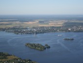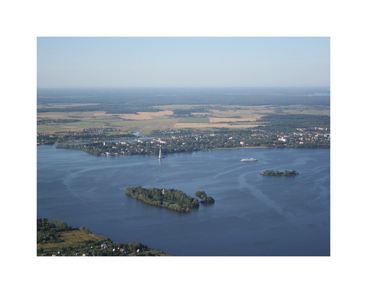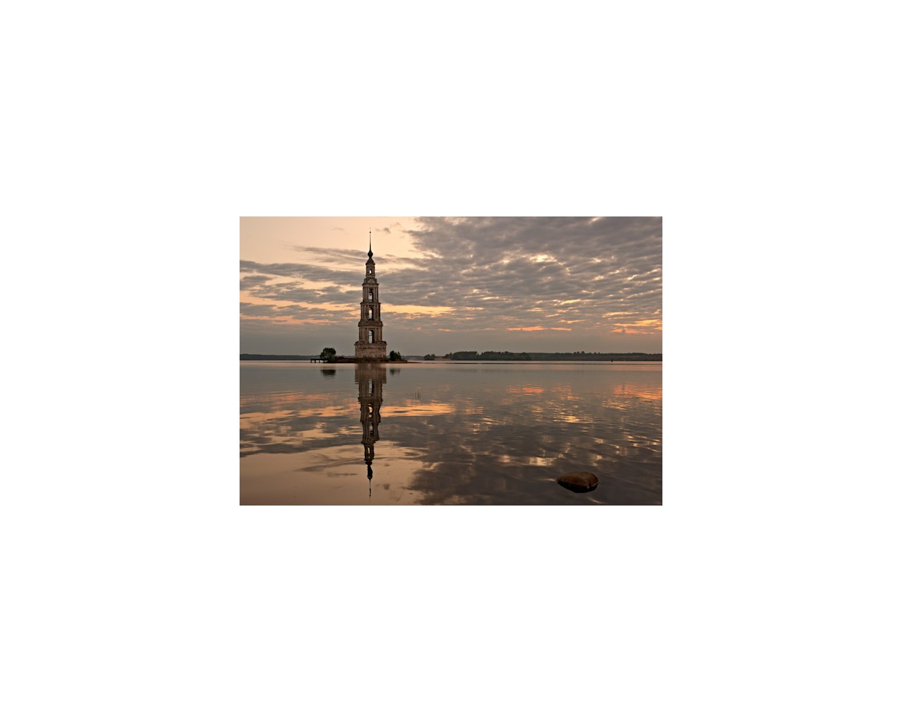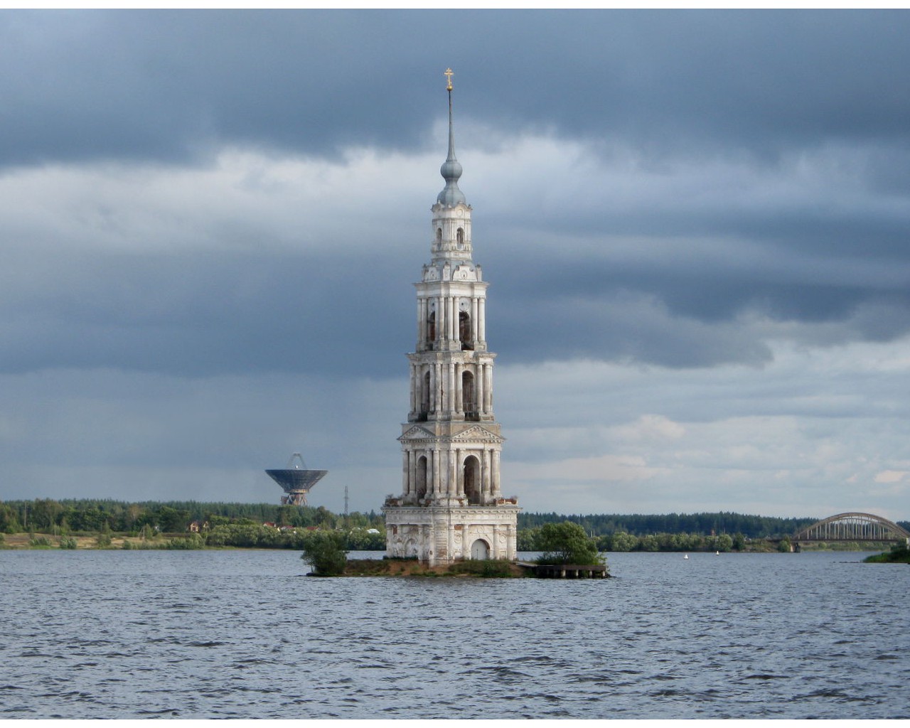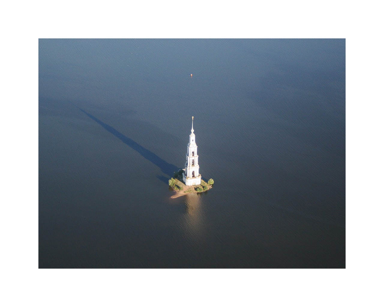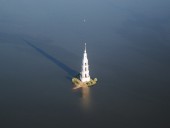 Колокольня в Калязине Тверской области, находящаяся в воде и выступающая над ее уровнем на 71 метр. В 12 веке на этом месте древнее новгородское поселение, а позднее монастырь Никола на Жабне. В 1238 году Никола на Жабне был сожжен татаро-монголами. После он неоднократно восстанавливался и разрушался. В 1694 году в центральной части появился каменный собор, а затем и нынешняя колокольня. Сооружения стояли до 1937 года. В связи с постройкой судоходного канала имени Москвы и частичным затоплением территории города собор был разобран, а колокольня оставлена как архитектурный памятник, достопримечательность всей Тверской области.Колокольня в Калязине Тверской области, находящаяся в воде и выступающая над ее уровнем на 71 метр. В 12 веке на этом месте древнее новгородское поселение, а позднее монастырь Никола на Жабне. В 1238 году Никола на Жабне был сожжен татаро-монголами. После он неоднократно восстанавливался и разрушался. В 1694 году в центральной части появился каменный собор, а затем и нынешняя колокольня. Сооружения стояли до 1937 года. В связи с постройкой судоходного канала имени Москвы и частичным затоплением территории города собор был разобран, а колокольня оставлена как архитектурный памятник, достопримечательность всей Тверской области.