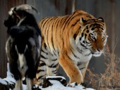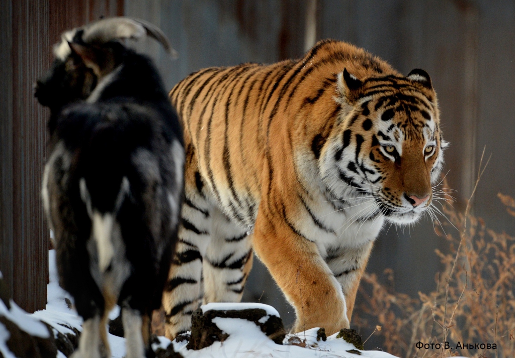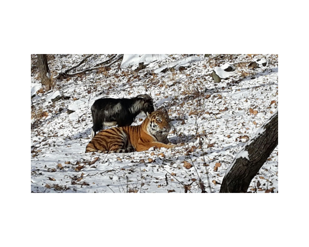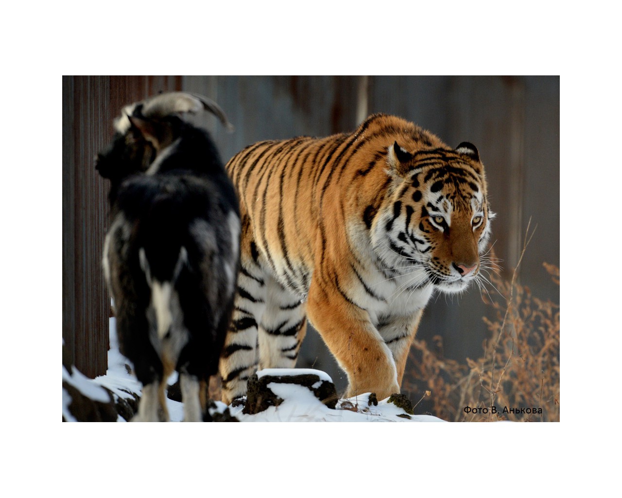 Тигры Сафари-парка два раза в неделю едят живую добычу. Тигр Амур умеет охотится на коз и кроликов. Но недавно тигру попался козёл, которого он есть не захотел, и всё потому что, козёл оказался очень смелым. Козла никто не научил бояться тигра. И Амур решил не связываться с таким смелым козлом, есть его не стал. Мало того, козёл выжил Амура из собственной спальни, и сам спит на его месте уже четвёртые сутки. Амуру пришлось перебраться на крышу убежища. Назвали смельчака Тимуром, это достойное имя для такого бесстрашного животного. Днём Амур и Тимур дружно выходят в большую вольеру и гуляют вместе. Тимур принял Амура за вожака, и всюду следует за ним. Бесстрашие Тимура и осторожность Амура привели к такому парадоксальному результату.