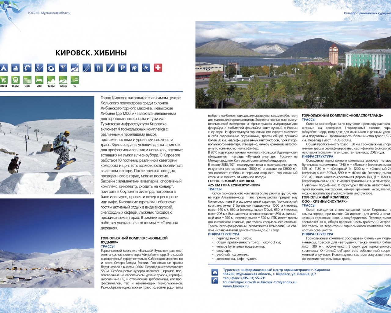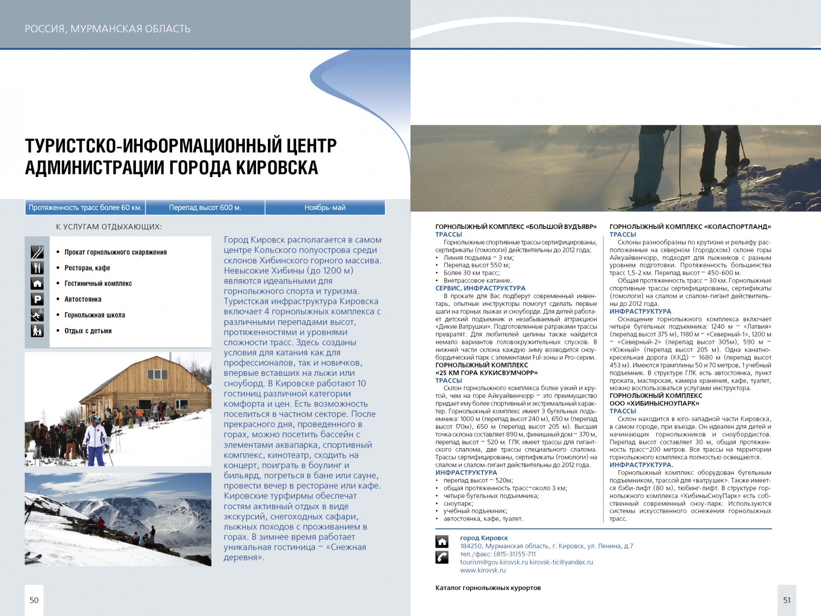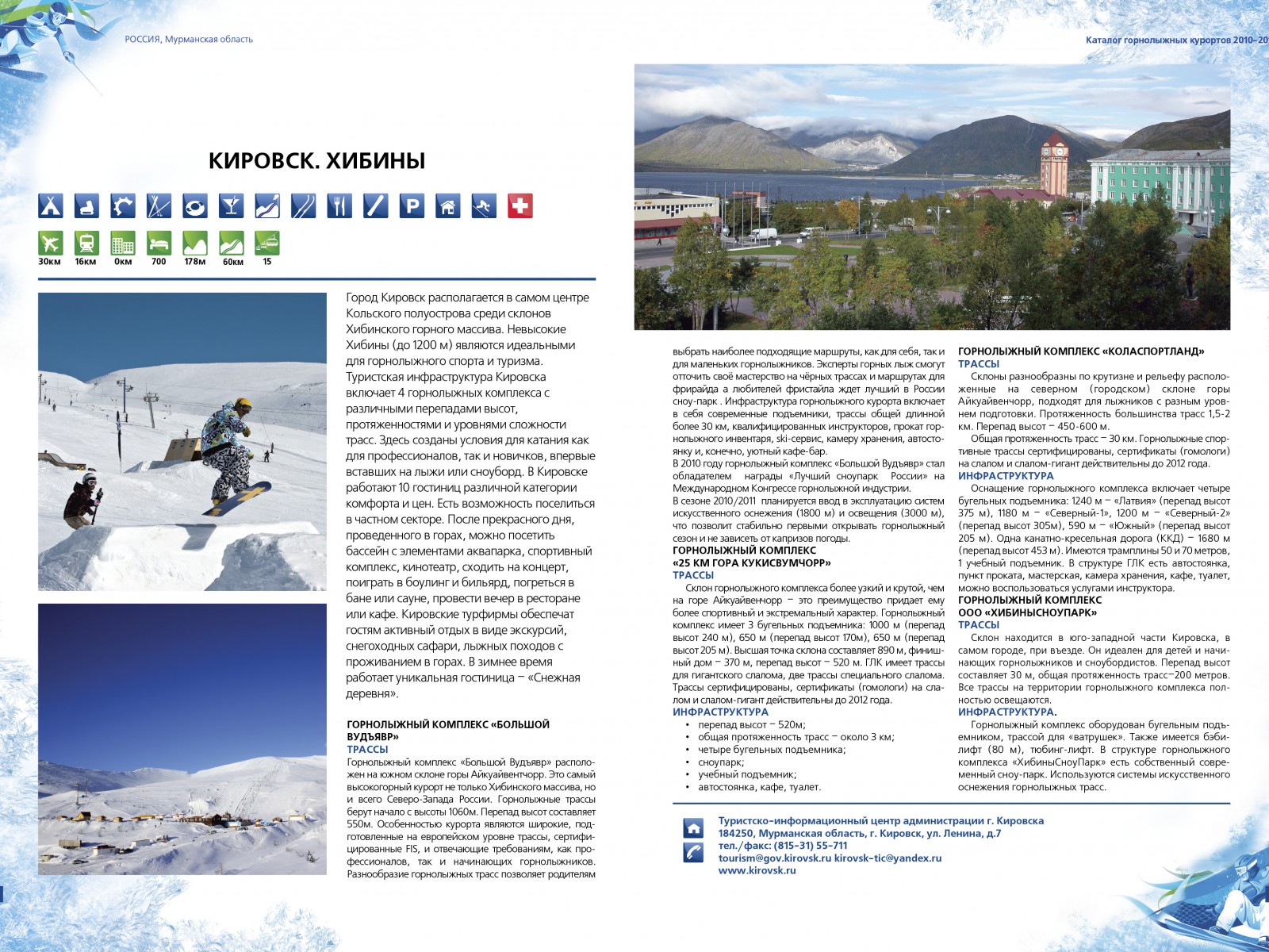 - развитие внутреннего и въездного туризма и содействие формированию и продвижению туристских продуктов на российском и международном рынках, в том числе: ежегоднаяорганизация экспозиций города Кировска на региональных, российских и международных выставках, таких как: «Интурмаркет» (г. Москва), «Кольский партнериат»(г. Мурманск), «Отдых для северян» (г. Мурманск), «Oulunerämessut» (г.Оулу, Финляндия), «INWETEX-CISTRAVELMARKET» (г.Санкт-Петербург), «Московский лыжный салон» (г. Москва), «Лыжный салон» (г. Санкт-Петербург), «Мурманская область инвестиционная » (г. Мурманск), в том числе и на объединенных стендах; участие в туристских и иных форумах, семинарах, конференциях, круглых столах, а также рекламно-информационное продвижение туристских ресурсов, нацеленное на формирование имиджа города Кировска как благоприятного для туризма и рекреации, в центральных и региональных СМИ, туристских изданиях, специализированных журналах и каталогах, интернет – ресурсах, а именно: «Горнолыжная индустрия в лицах», «Комсомольская правда», «Первые лица: Власть. Бизнес. Общество.», «Дважды-два», «Кировский Рабочий», «Российская газета», интернет-издание skistop.ru; сотрудничество и информационный обмен с ведущими он-лайн ресурсами в области горнолыжного туризма: ski.ru и riderhelp.ru, телеканалы: « РБК», «Россия-24», «RTG», «Мурман» и другие.