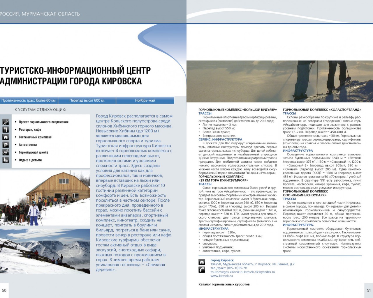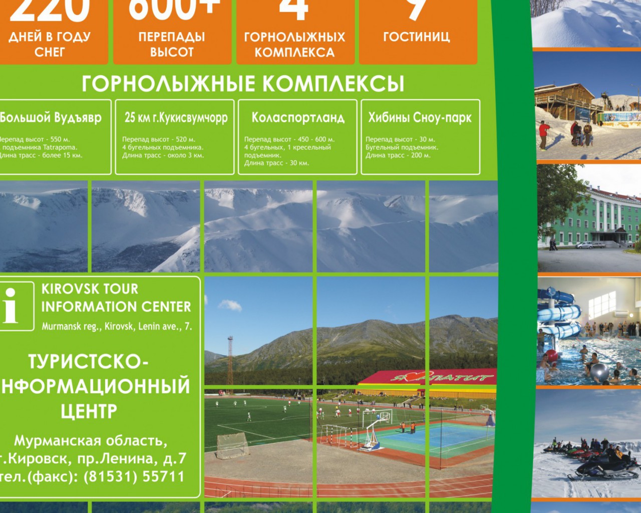 - совершенствование нормативного и информационного обеспечения туристской отрасли, в том числе: подготовка, дизайн, изготовление, актуализация и распространение буклетов, каталогов (на двух языках), другой информационной и сувенирной продукции о туристских возможностях и ресурсах города Кировска: изготовлены два промо-ролика о зимних и летних возможностях для отдыха в городе Кировске, один из которых занял второе место на Всероссийском конкурсе видеороликов «ПереДвижение-2014», также ролики успешно транслировались на выставочных мероприятиях, раздавались туристам; участие в работе официального сайта органов местного самоуправления города Кировска, постоянная актуализация информации о туристских ресурсах на нем.