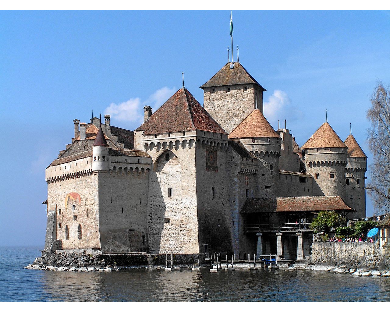 Шильонский замок стоит на скале, незначительно возвышающейся над поверхностью озера, и соединён с берегом мостом. Сочетание природных условий и особенностей постройки позволяли замку контролировать стратегически важную дорогу, пролегавшую между озером и горами. Долгое время эта дорога к Сен-Бернарскому перевалу служила единственным транспортным путём из Северной Европы в Южную. Она не утратила своего значения до сих пор, и всего в 200 м от замка можно видеть построенное на пятидесятиметровых пилонах и как бы парящее над замком шоссе Е27, соединяющее Швейцарию и Италию.