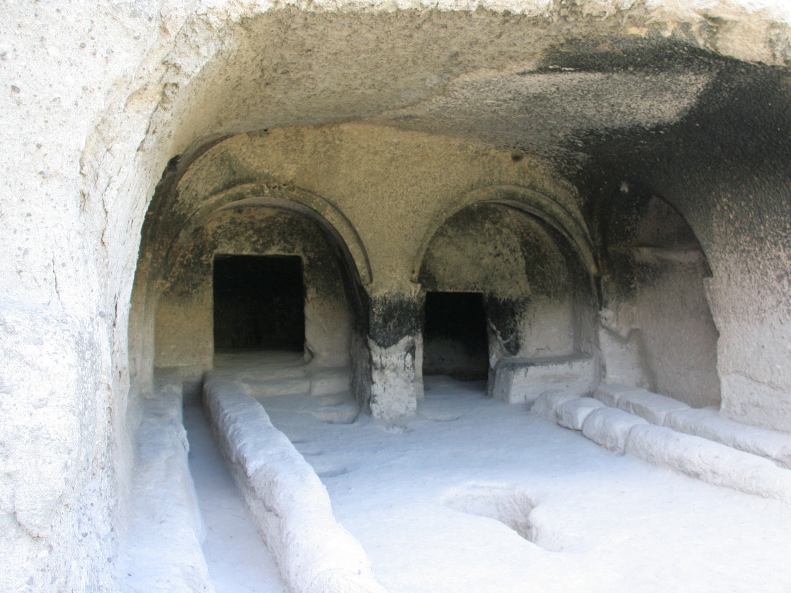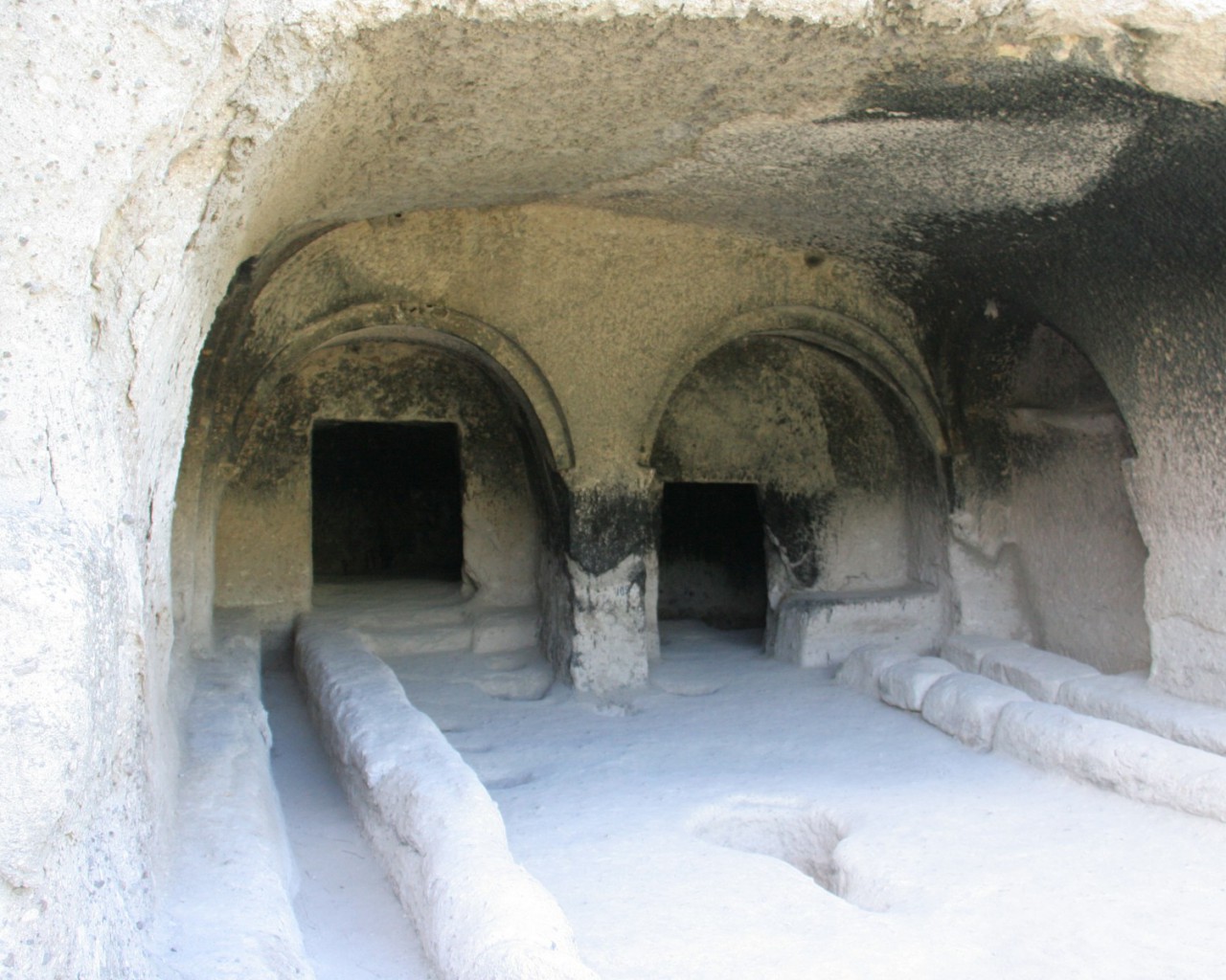 Интересно, что помещения высечены в скале до глубины 50 м. Сохранились потайные ходы, остатки водопровода и оросительной системы.