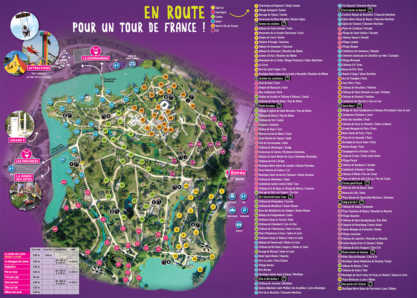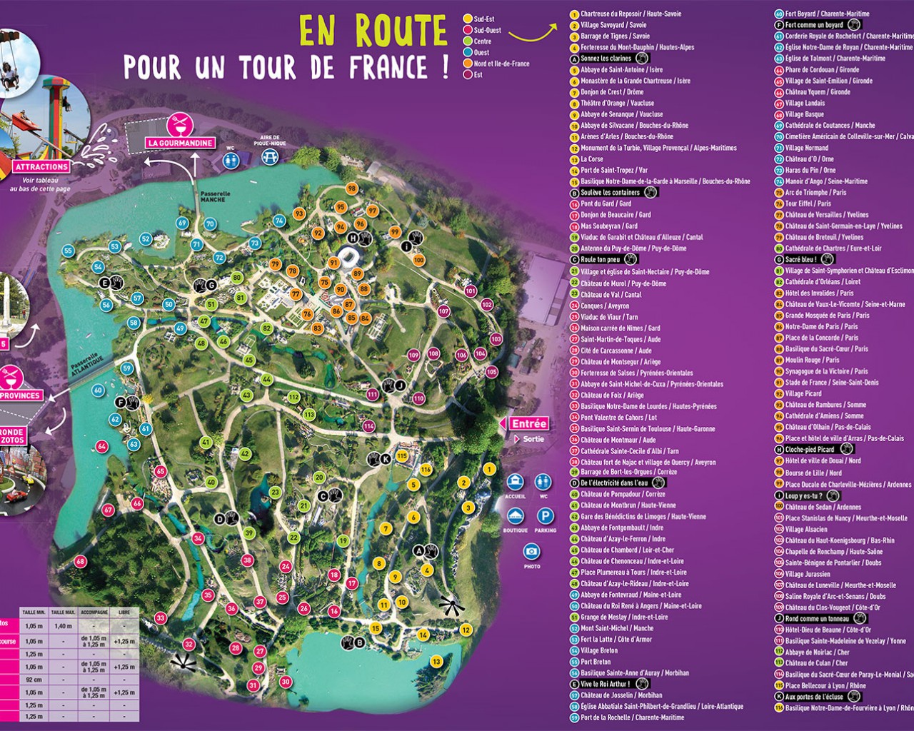 Посетить парк Франция в миниатюре будет полезно тем, кто не может определиться, куда в этой стране отправиться в первую очередь. Его территория представляет собой карту Франции, и каждый макет находится именно там, где размещается его оригинал. Окружают парк бассейны, которые символизируют омывающие страну океаны и моря. Сама территория испещрена ручейками, носящими названия французских рек.