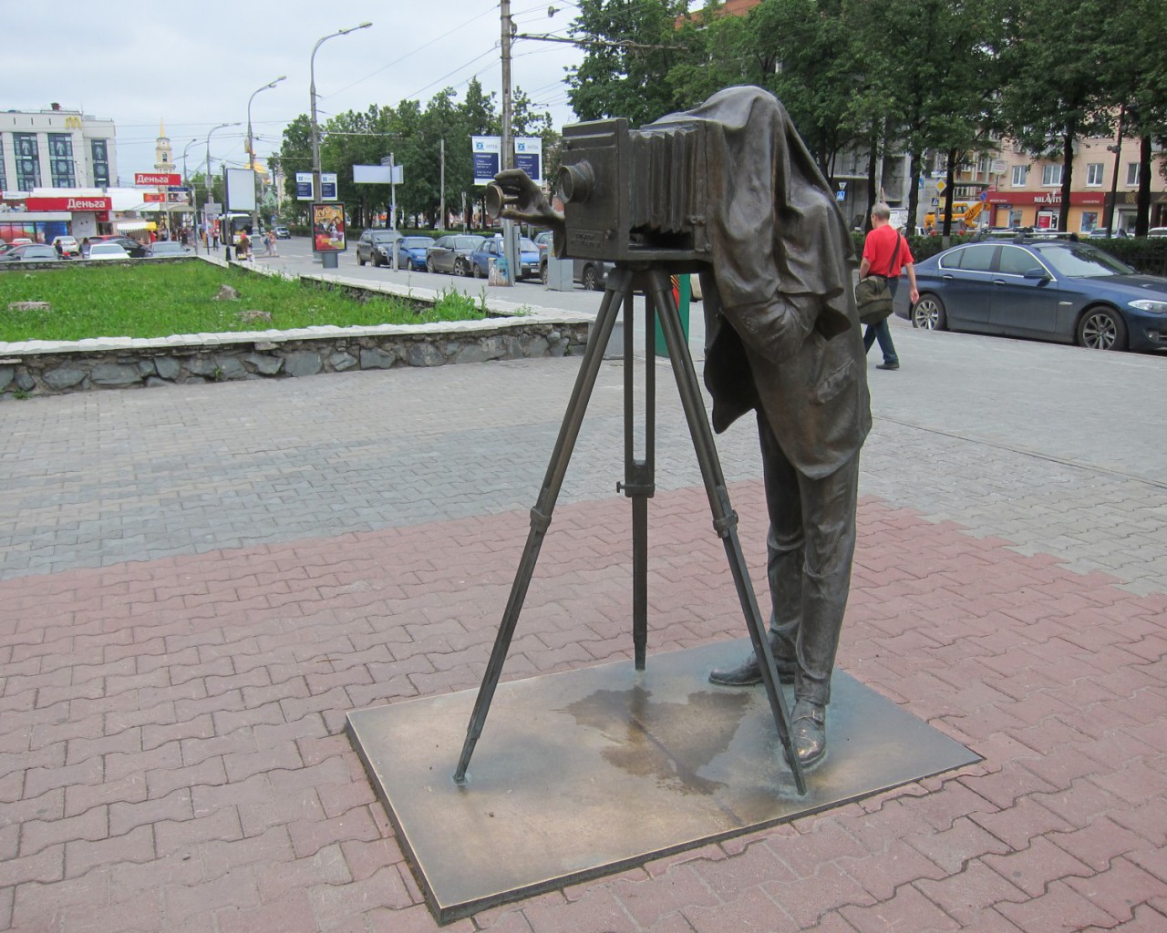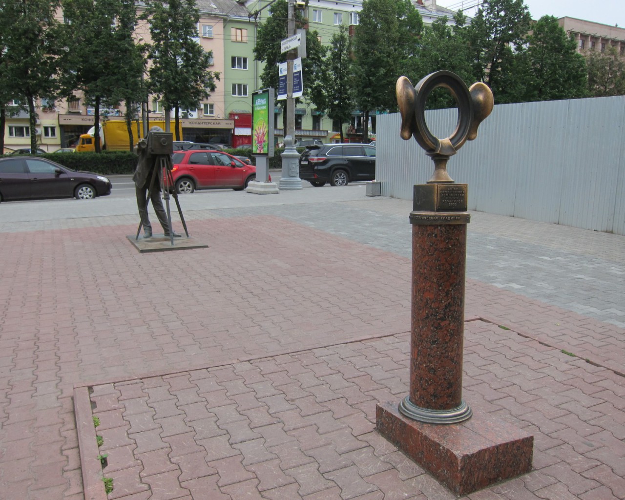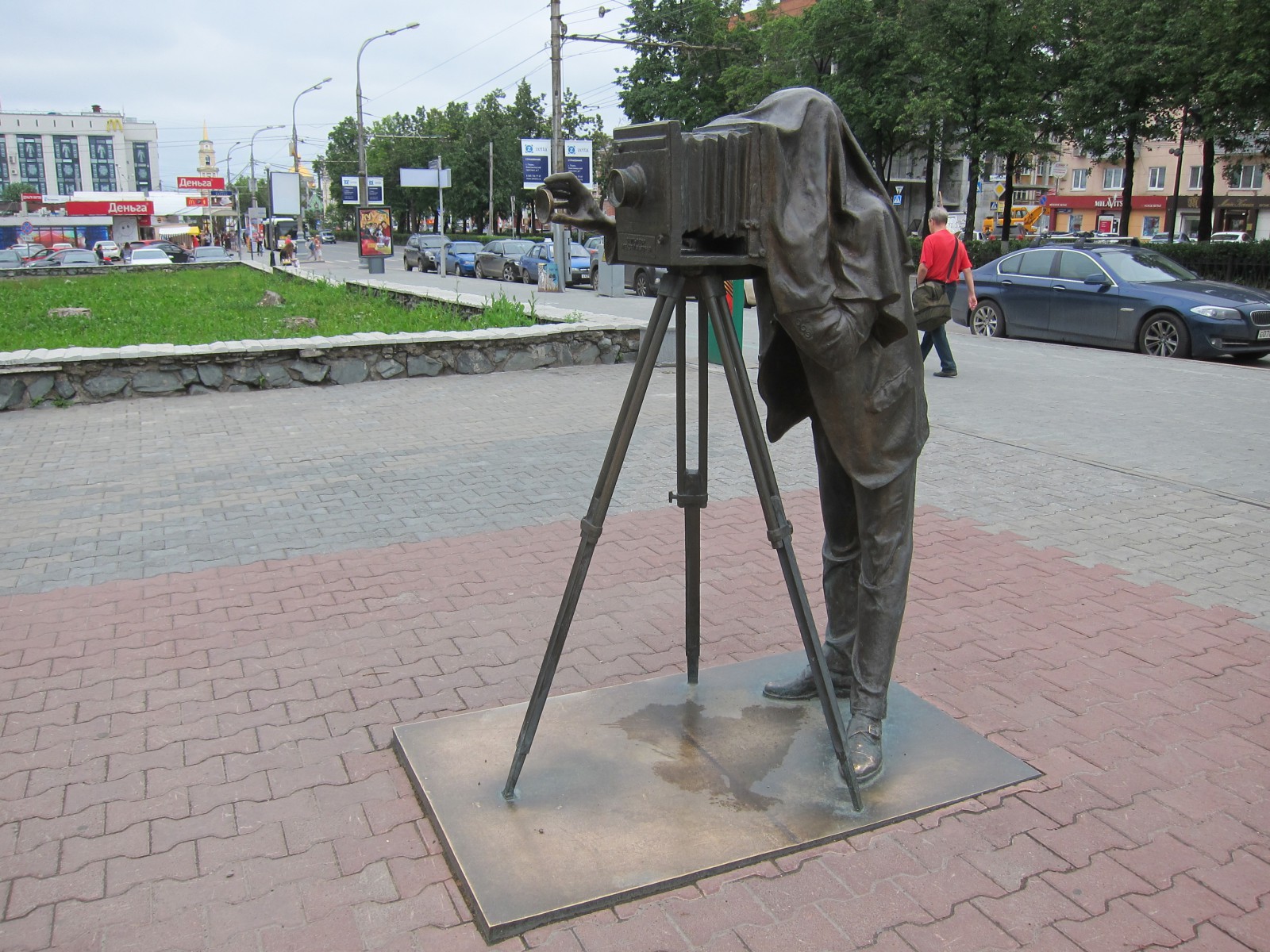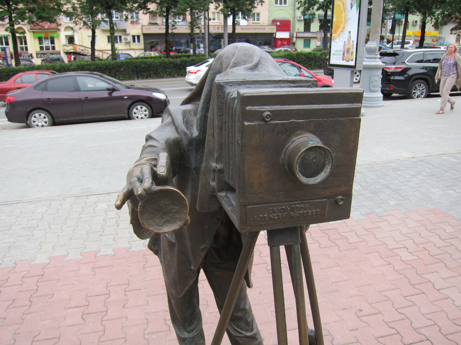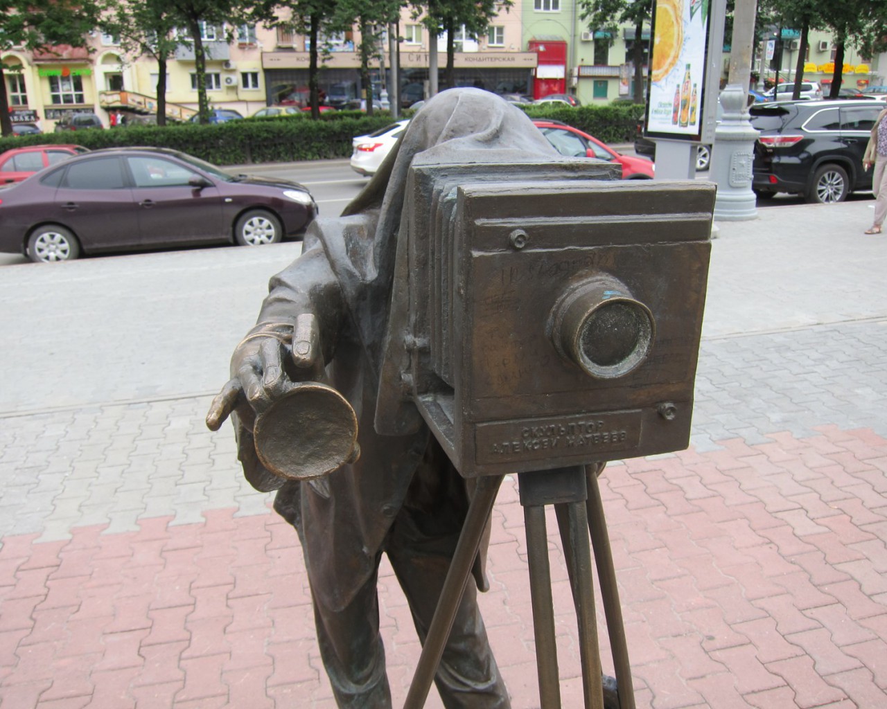 Скульптура состоит из двух частей — фигуры фотографа и круглой рамки с большими ушами, в которую фотографирующиеся могут поместить своё лицо.