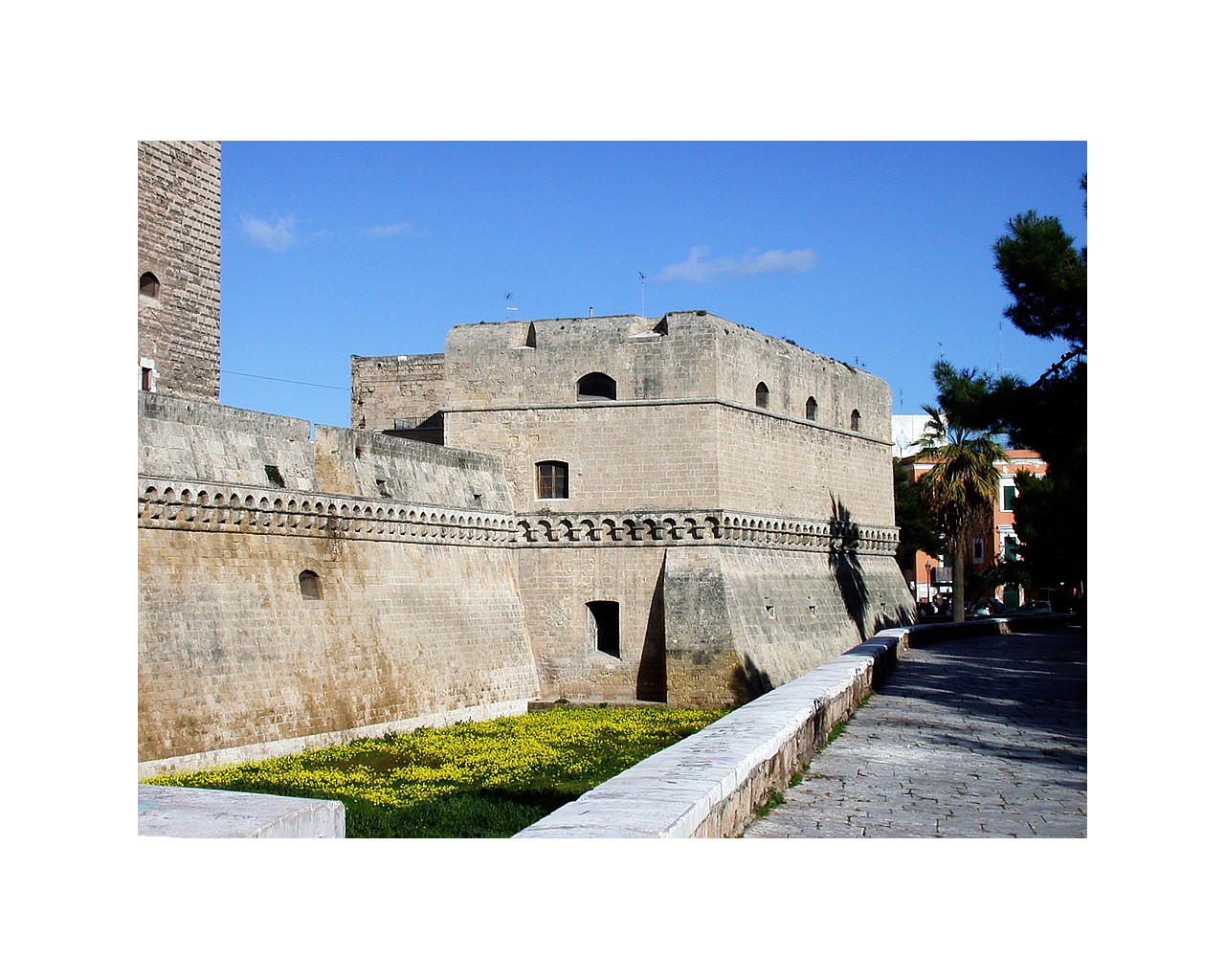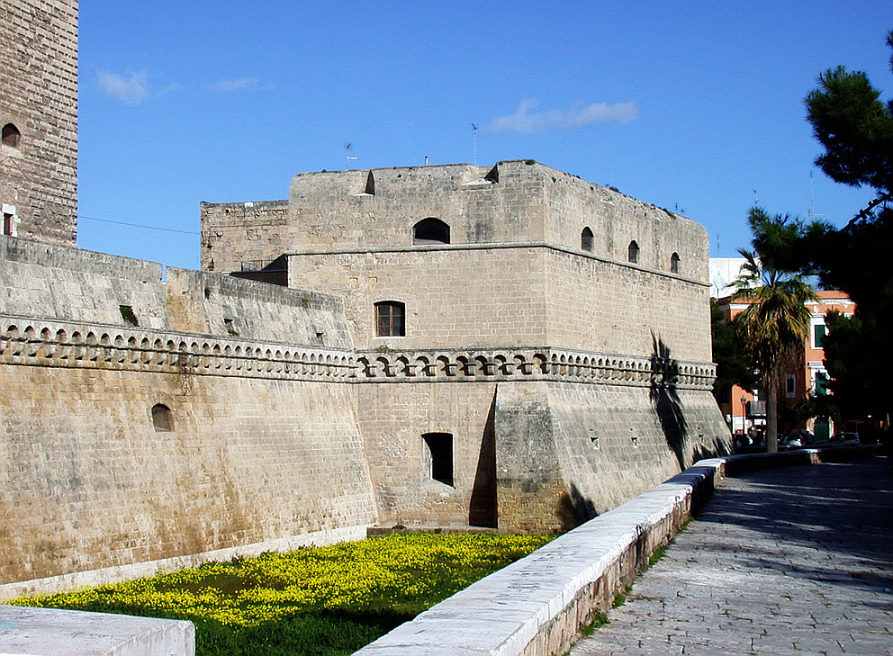 В 1156-м году Швабский замок был разрушен во время осады Бари сицилийским королем Вильгельмом I Злым, и восстановлен только в 1233-м году по приказу императора Священной Римской империи Фридриха II. В годы правления Анжуйской династии замок несколько раз перестраивался, а после того, как его приобрел герцог Фердинанд Арагонский, он был подарен могущественному итальянскому семейству Сфорца, которое его расширило и облагородило. Затем он находился в собственности Боны Сфорца, королевы Польши, а после ее смерти в 1577-м году был возвращен Неаполитанскому королевству. Тогда же он был превращен в тюрьму и военные казармы.