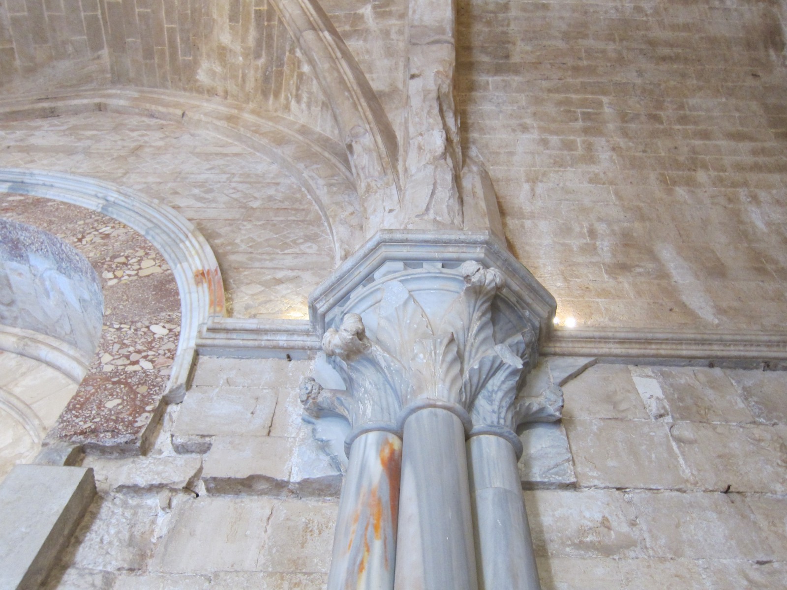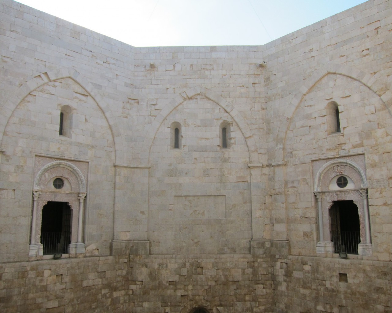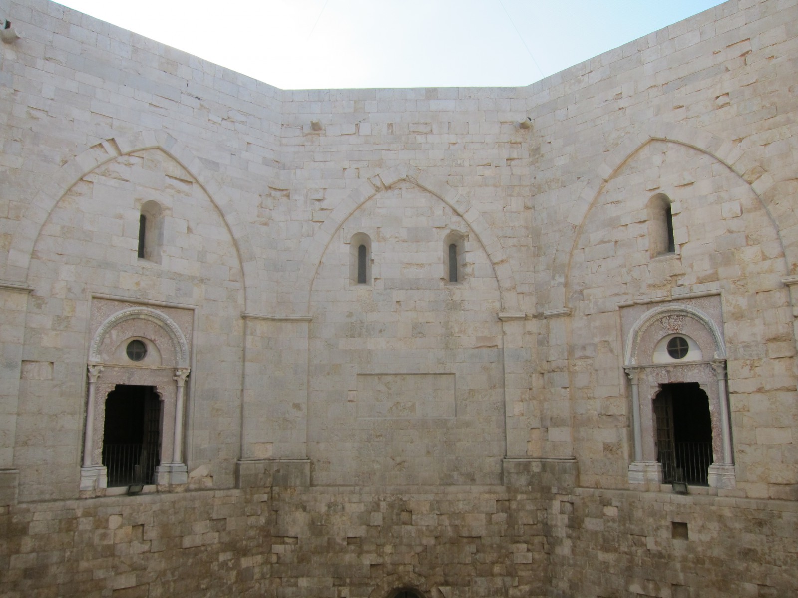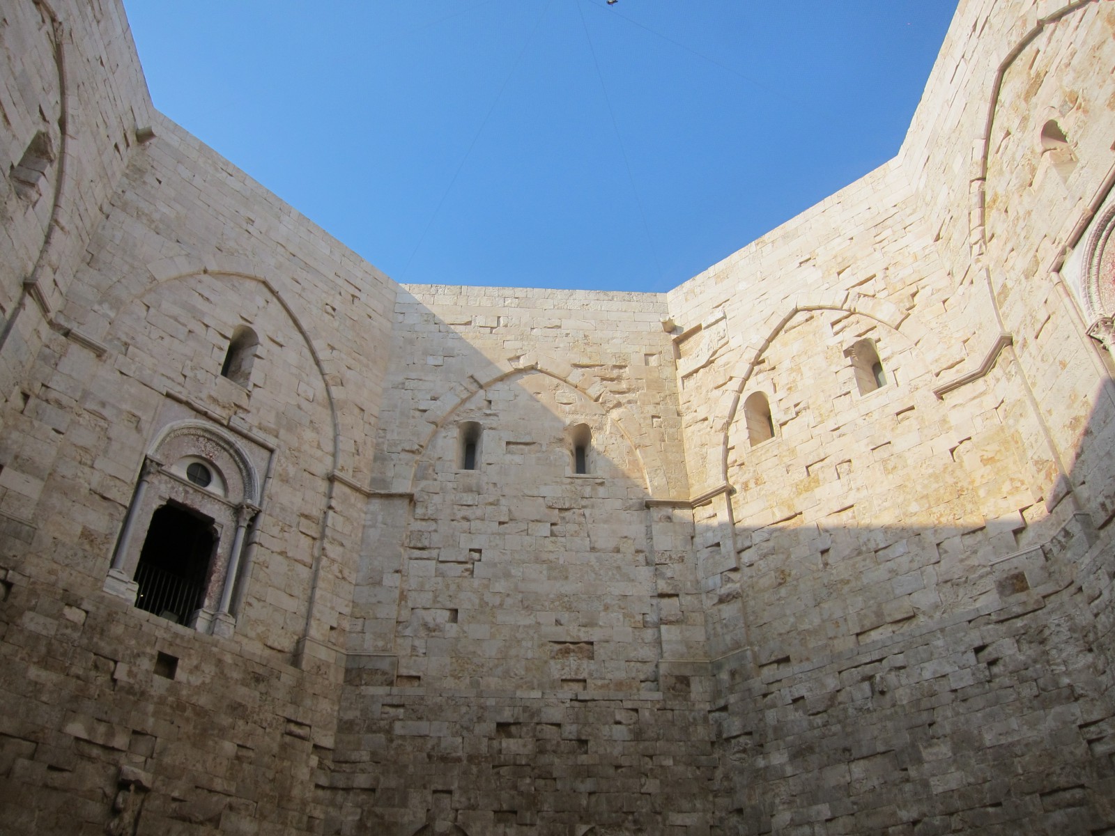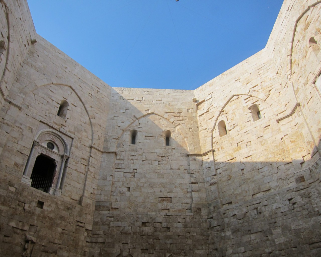 Внутренний двор замка Кастель дель Монте по форме соответствует очертаниям самого здания. Высота сооружения с внутренней стороны дворика составляет 20,5 метров, лишь угловые башни гордо вдаются ввысь. На крыше замка аккуратно в виде елочки выложена мощеная терраса, с которой открывается потрясающий панорамный вид на море.