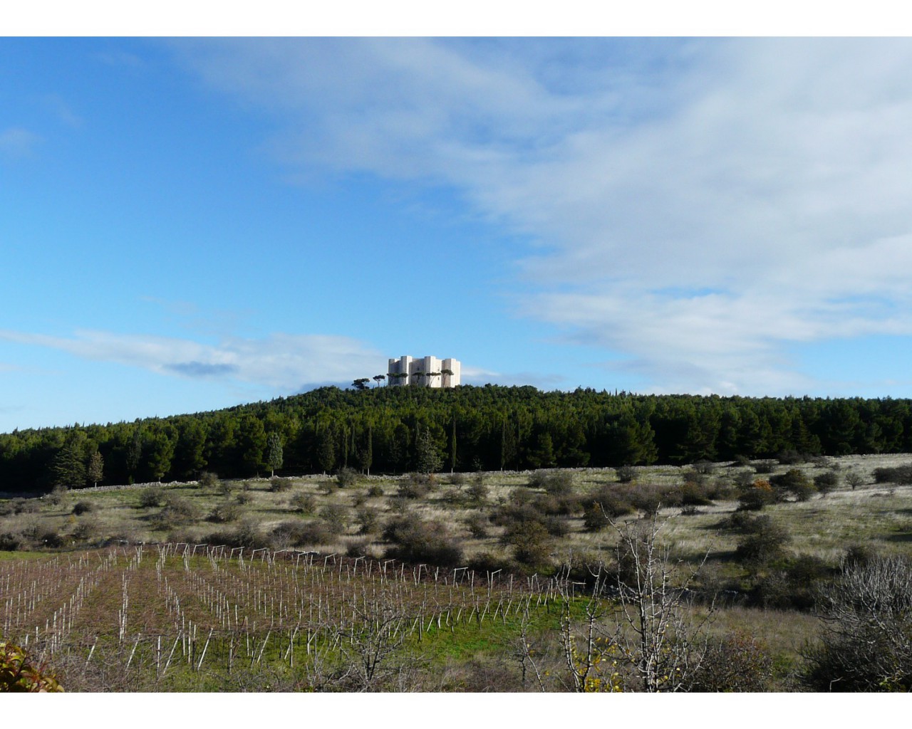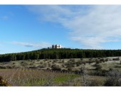 Замок дель Монте (Castel del Monte) одиноко возвышается на уединенном холме Западной Мурдже в пустынной местности города Андрия провинции Бари, на высоте 560 метров над уровнем моря. Современное название замковый комплекс получил лишь в конце XV века, первоначальное название не сохранилось. Назван замок Кастель дель Монте был в честь одноименного старинного поселения у подножия холма, на котором находился небольшой монастырь Санта-Мария-дель-Монте. Часто местные жители Андрии называют его «Короной Апулии».