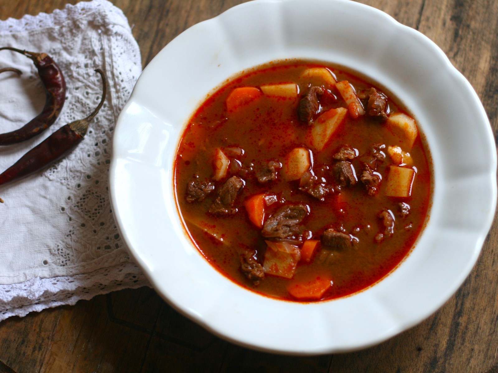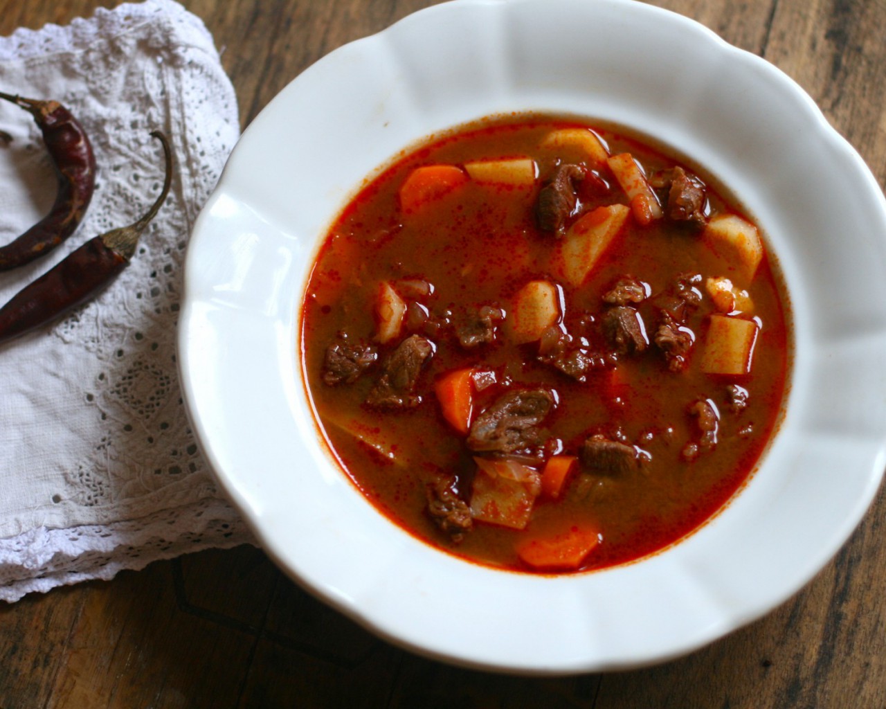 Гуляш — венгерское национальное блюдо. Кусочки говядины или телятины, тушёные с копчёным шпиком, луком, перцем (паприкой) и картофелем. Блюдо относится к категории густых супов. Изначально суп с различными добавками был традиционной едой венгерских пастухов и готовился в котлах на костре.