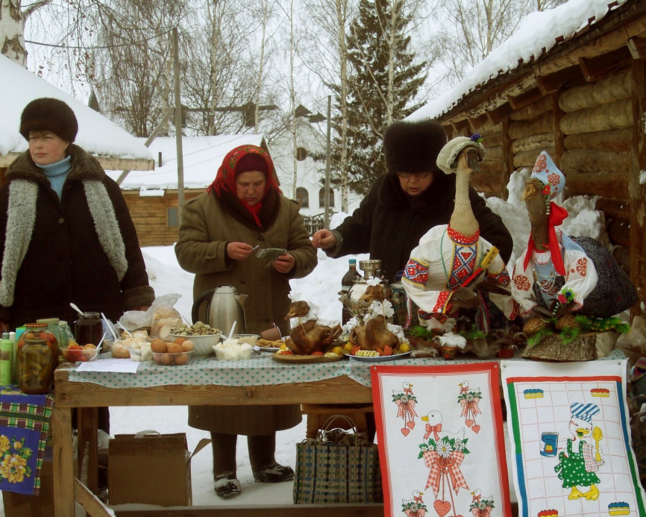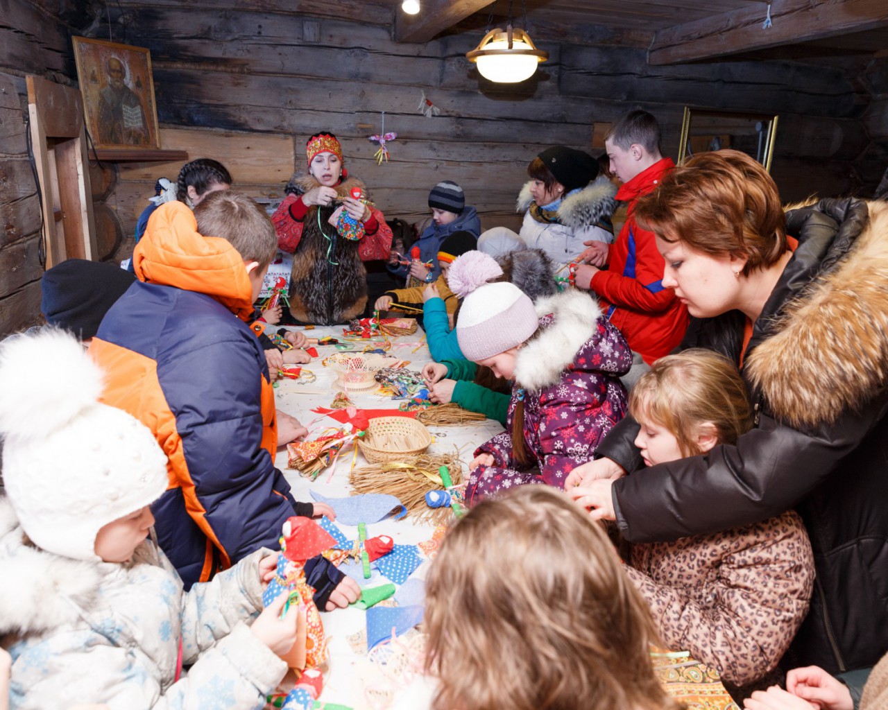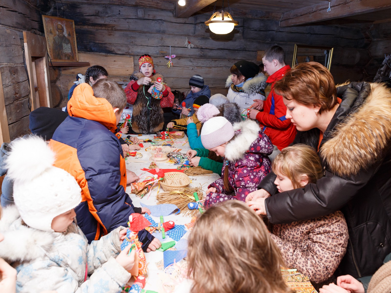 В доме из села Тынцы специалисты Детского музейного центра провели мастер-класс по изготовлению обрядовой куклы. Помимо «уличного» чучела Масленицы, которое сжигали, принято было делать и маленькую «домашнюю» Масленицу, младшую сестру большой Масленицы, куколку-оберег, которая в течение года хранила домашний очаг и исполняла желания.