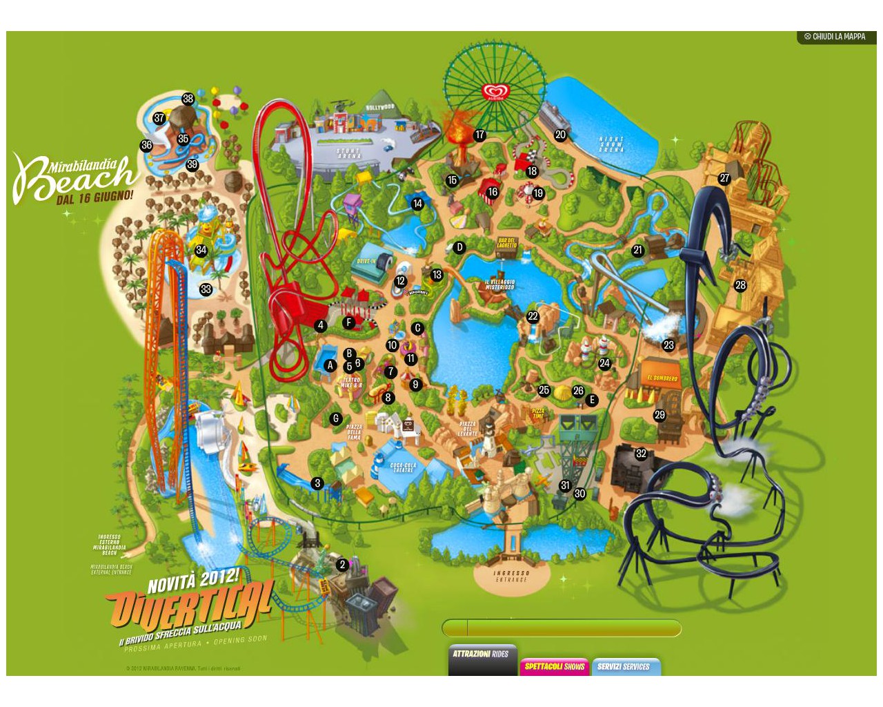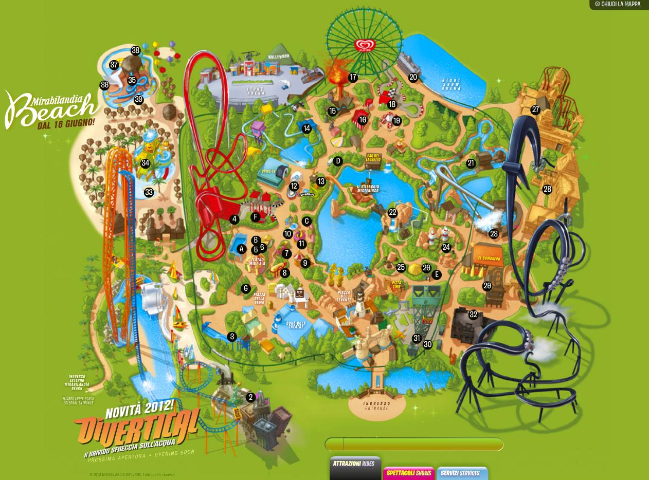 Один из самых крупных парков аттракционов в Европе, Мирабиландия, занимает территорию в 850 000 кв. метров примерно между городом Равенна и популярным курортом Римини на побережье Адриатики. Вокруг парка и непосредственно на его территории раскинулись роскошные сады, которые окружают три живописных озера.
