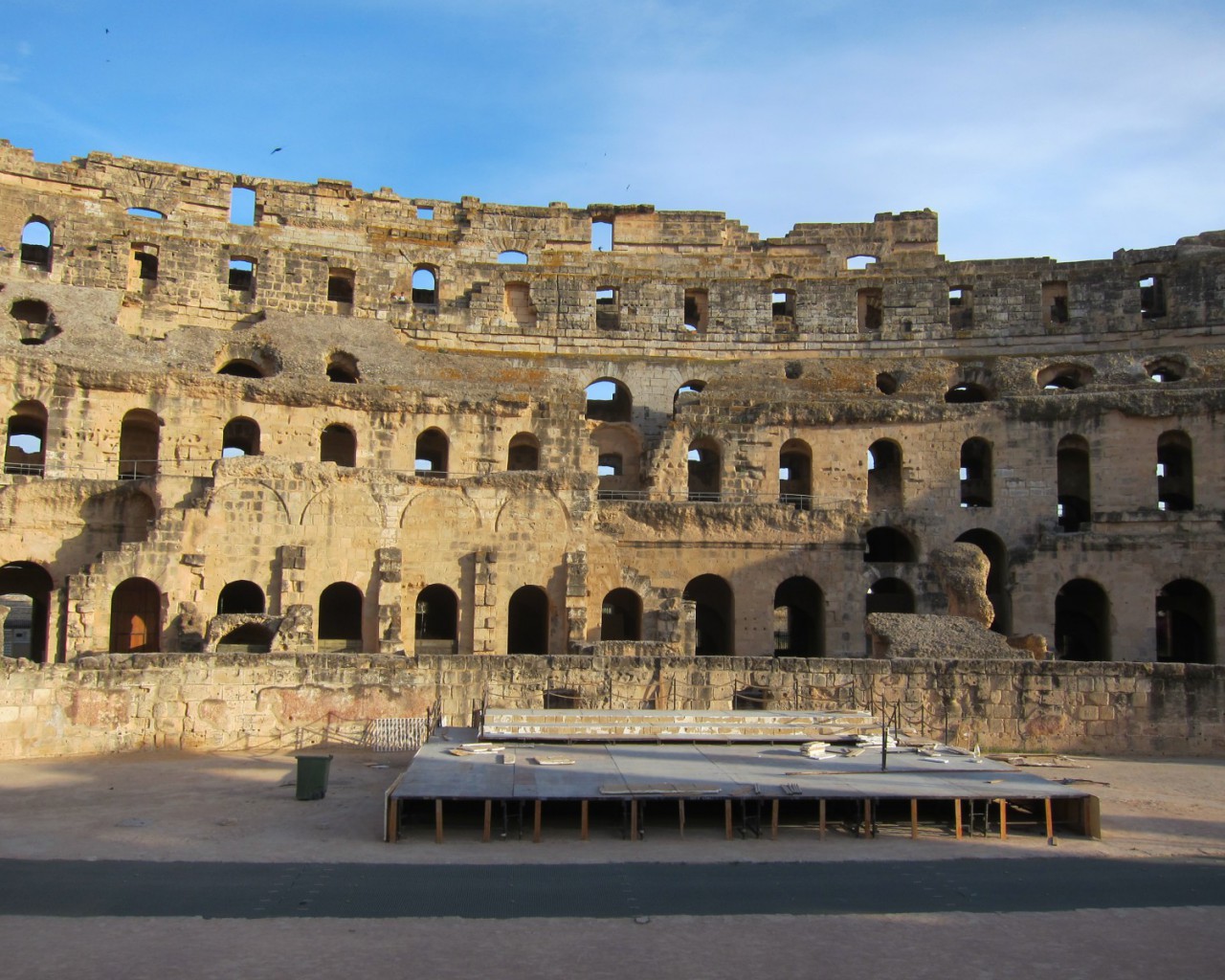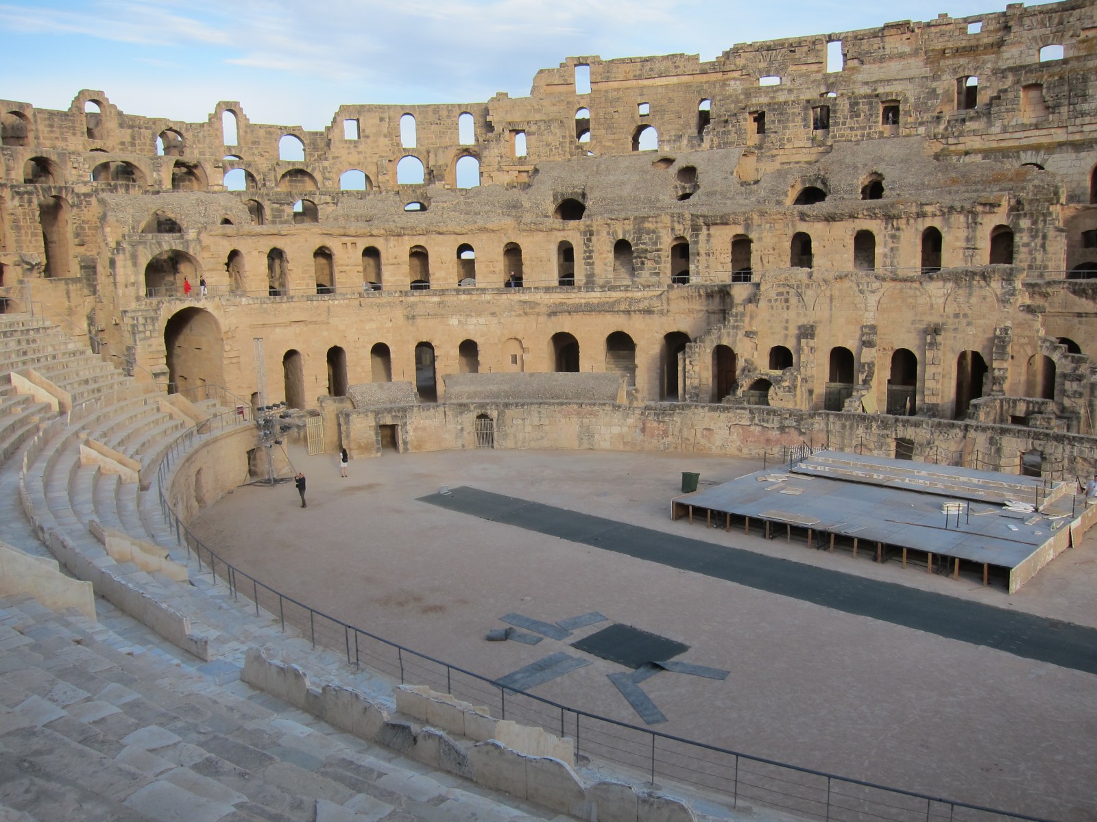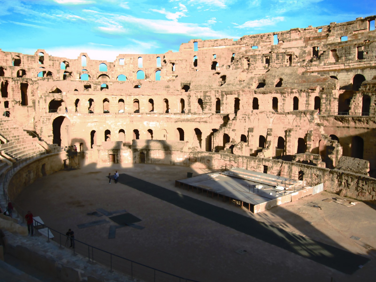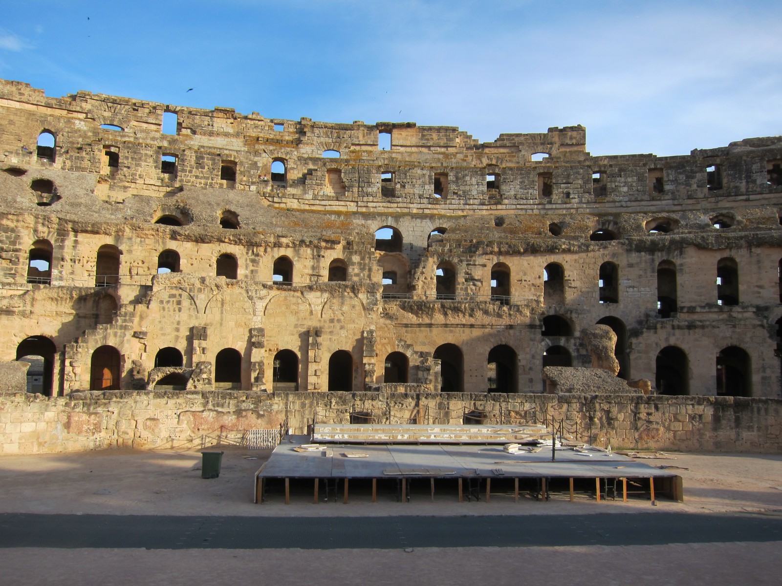 До VII века творение древнеримских архитекторов стояло нетронутым. Арабские жители города начали использовать ненужный им амфитеатр в качестве источника бесплатного строительного камня. Постройка была выполнена из желтоватого песчаника, легкого в обработке. Каменные глыбы были использованы для строительства арабского города Эль-Джем и для постройки соборной мечети в Кайруане.