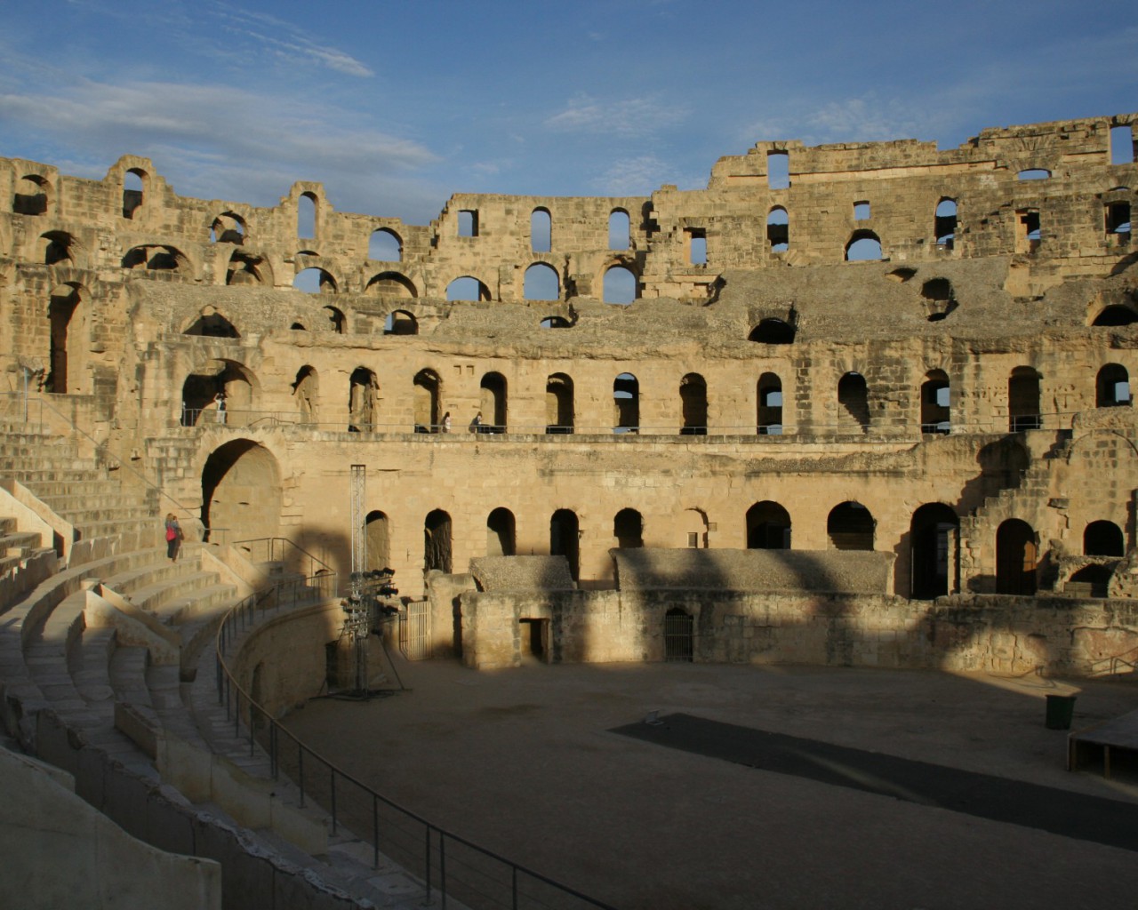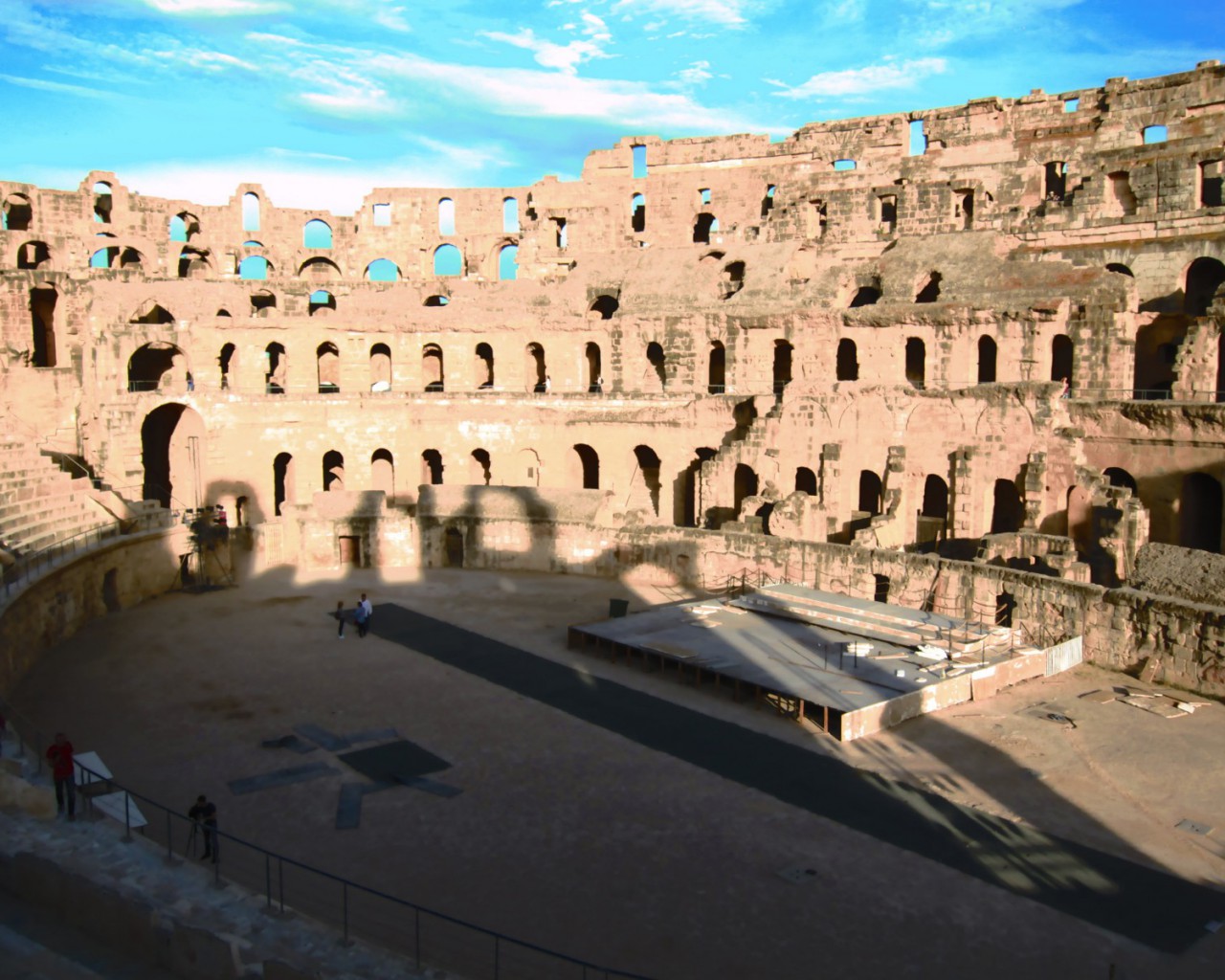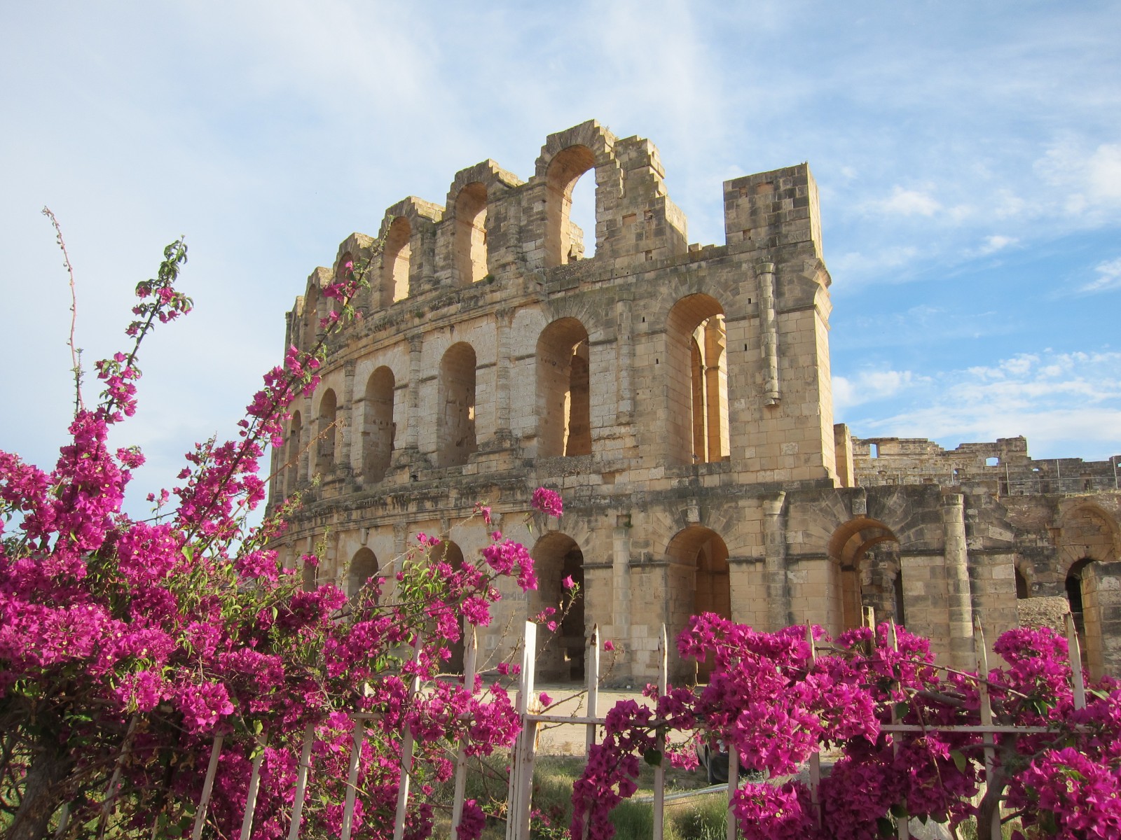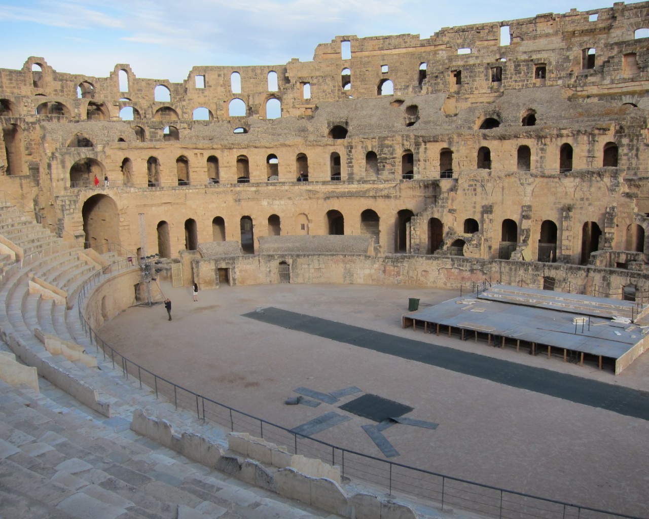 До VII века творение древнеримских архитекторов стояло нетронутым. Арабские жители города начали использовать ненужный им амфитеатр в качестве источника бесплатного строительного камня. Постройка была выполнена из желтоватого песчаника, легкого в обработке. Каменные глыбы были использованы для строительства арабского города Эль-Джем и для постройки соборной мечети в Кайруане.
