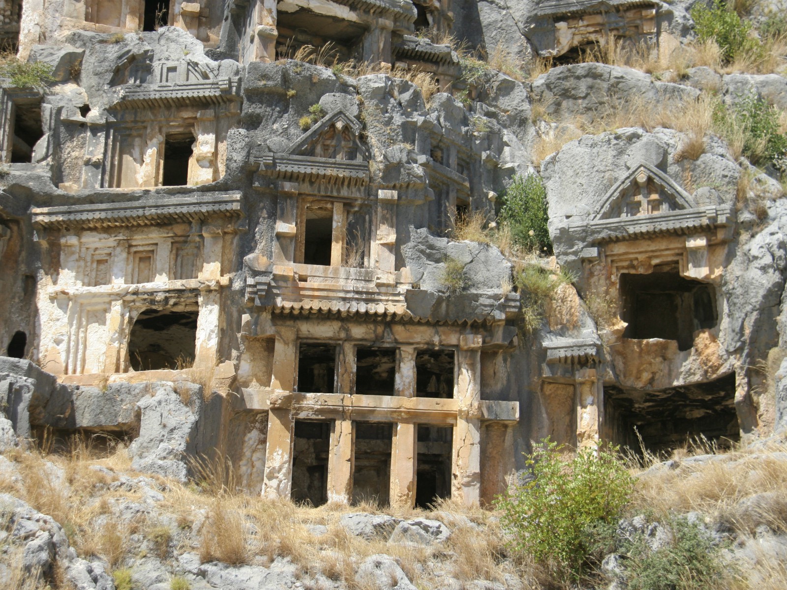 Ликийские гробницы Миры высекали в скале, и другие строительные материалы для некрополя не использовали. Фасады захоронений делали похожими на дома или храмы. На них можно увидеть подобие пилонов, колонн, резных дверей и рельефных изображений. Некоторые гробницы оформлены вырубленной в скале двухскатной крышей.