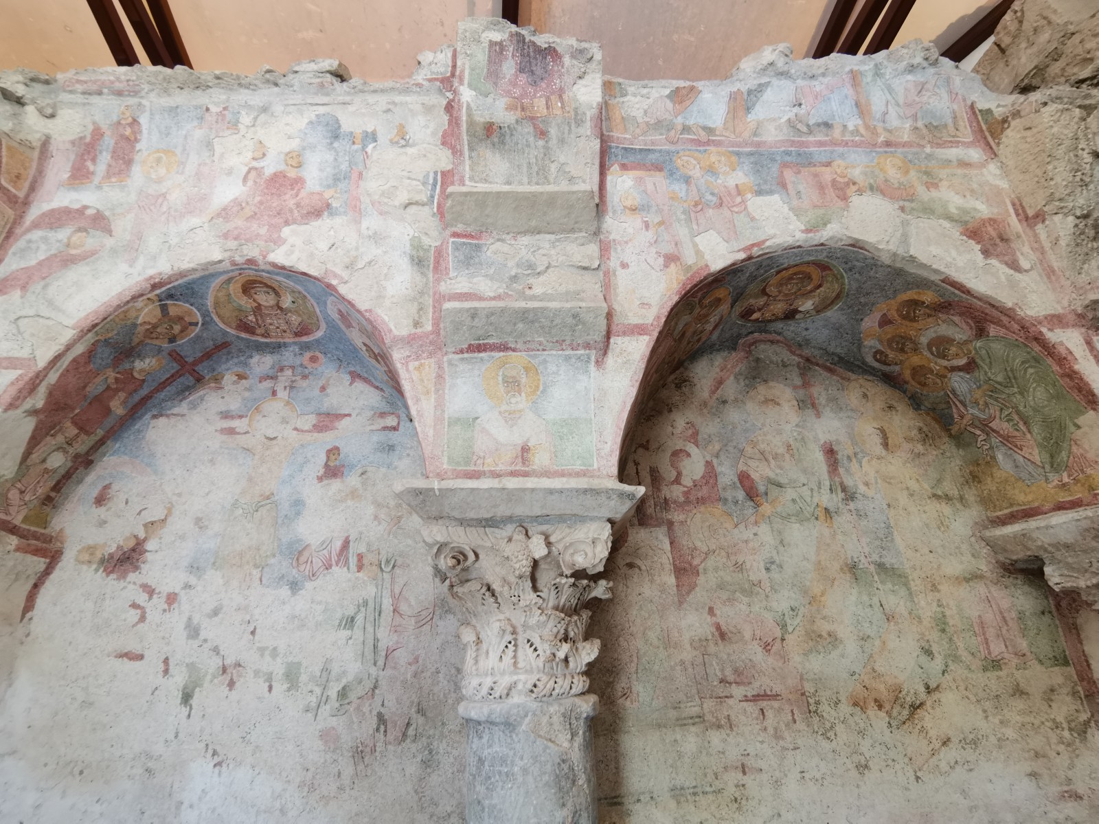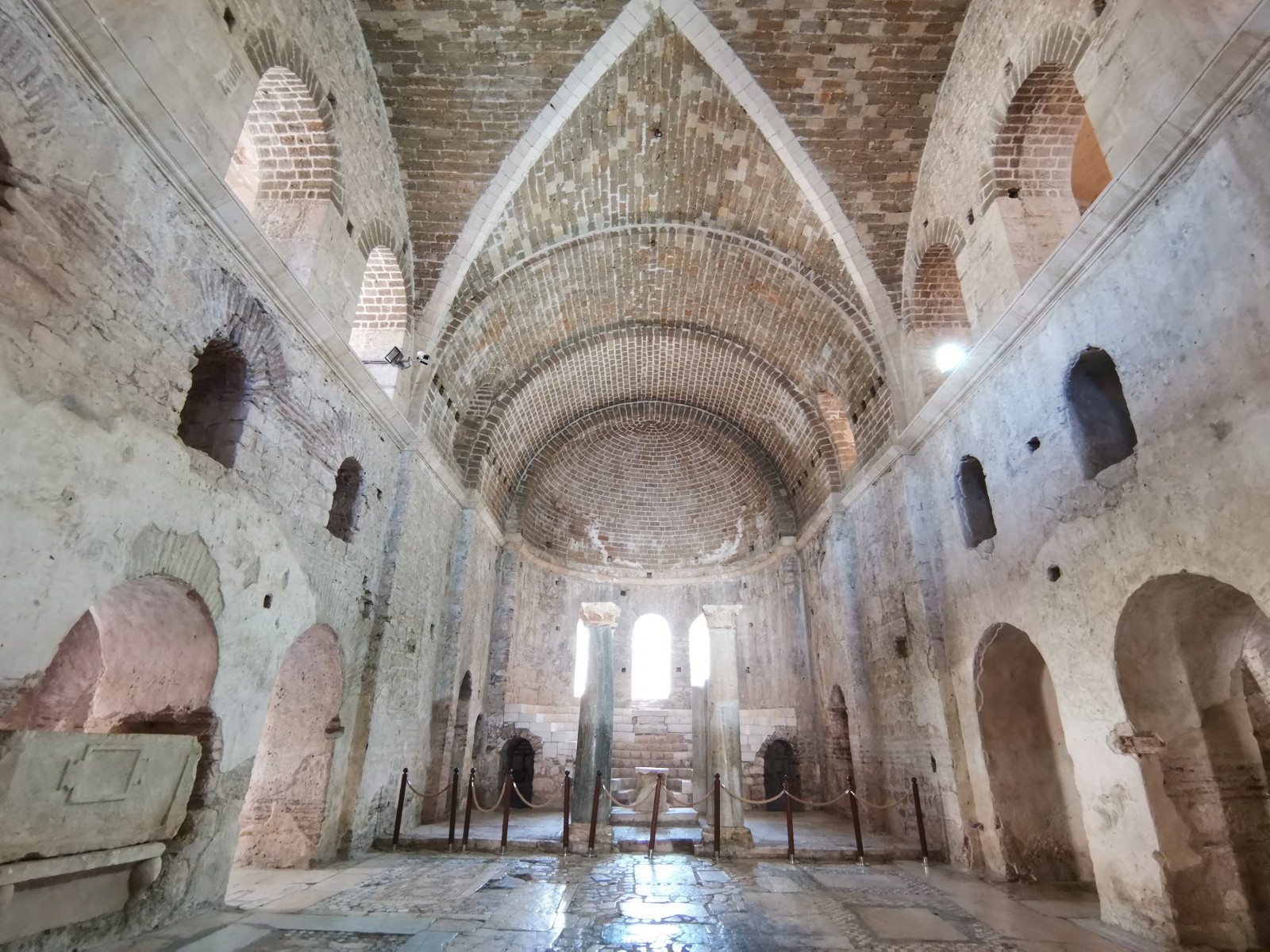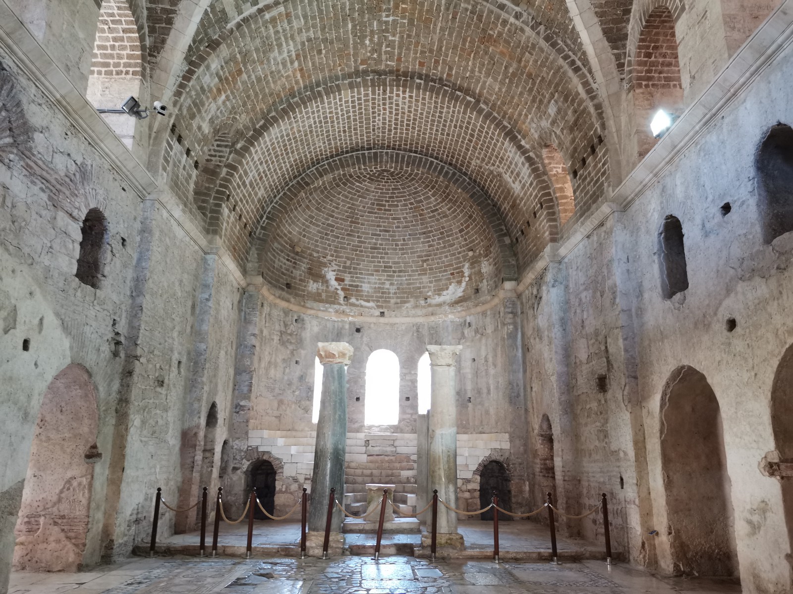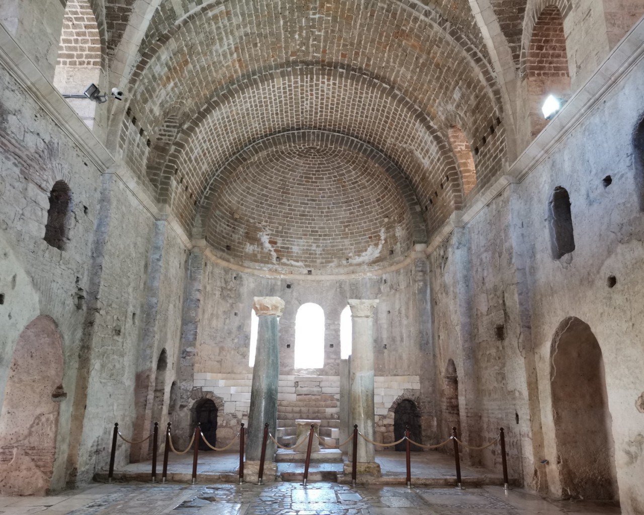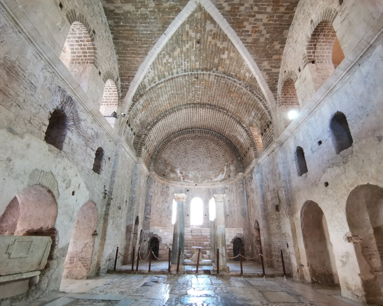 Перед входом в церковь расположены внутренний двор и двойной нартекс с крестово-вспарушенными сводами. Стены церкви были украшены фресками XI и XII веков, чьи фрагменты можно различить и сегодня, а пол был выложен мозаиками с геометрическими узорами. В полукруглой части центрального нефа находился синтронон с рядом мест для священников, кафедрой епископа и нижней галереей. Центральный неф отделён от боковых приделов сводчатыми галереями. Крышу церкви изначально венчал купол, во время реставрации заменённый сводом.
