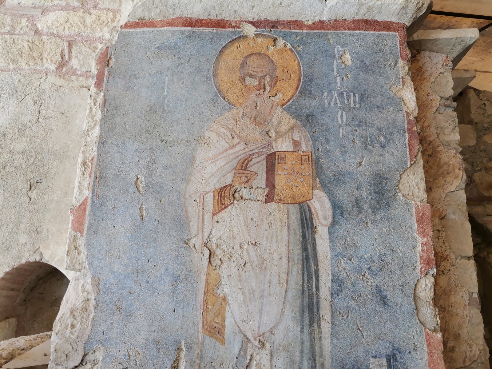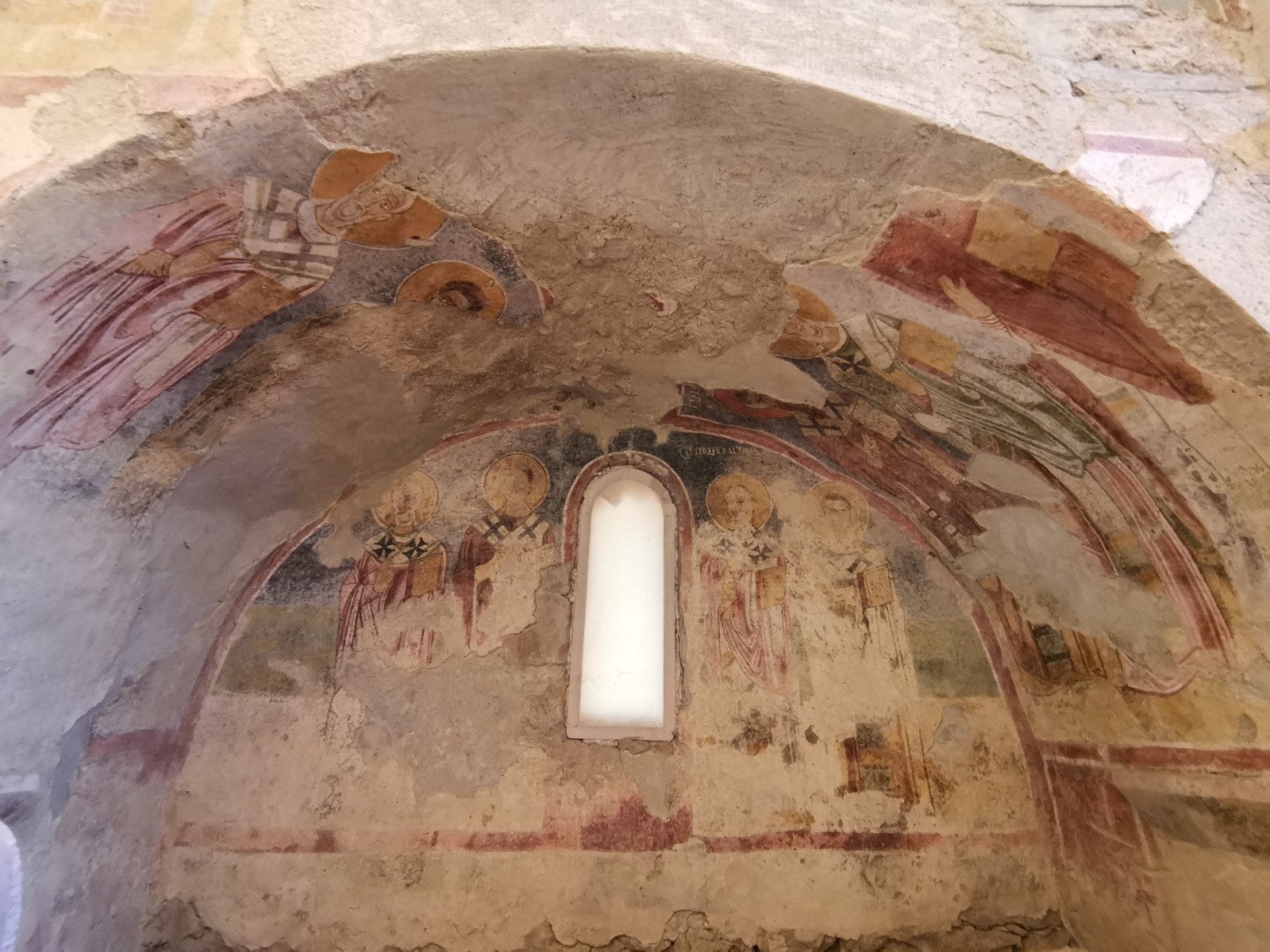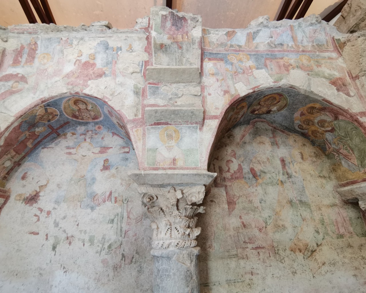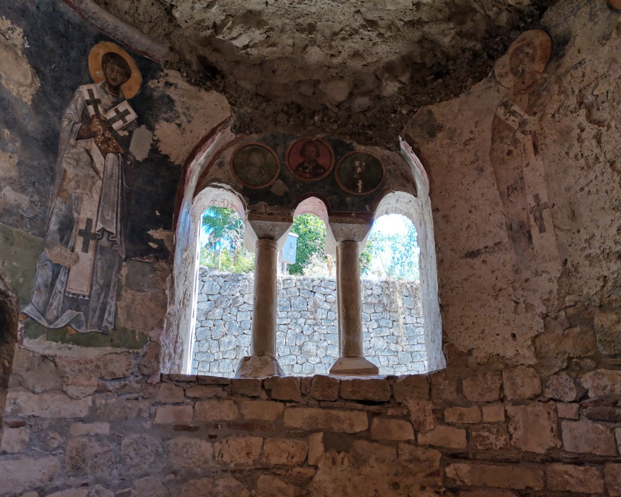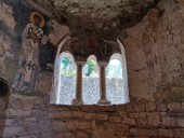 Перед входом в церковь расположены внутренний двор и двойной нартекс с крестово-вспарушенными сводами. Стены церкви были украшены фресками XI и XII веков, чьи фрагменты можно различить и сегодня, а пол был выложен мозаиками с геометрическими узорами. В полукруглой части центрального нефа находился синтронон с рядом мест для священников, кафедрой епископа и нижней галереей. Центральный неф отделён от боковых приделов сводчатыми галереями. Крышу церкви изначально венчал купол, во время реставрации заменённый сводом.