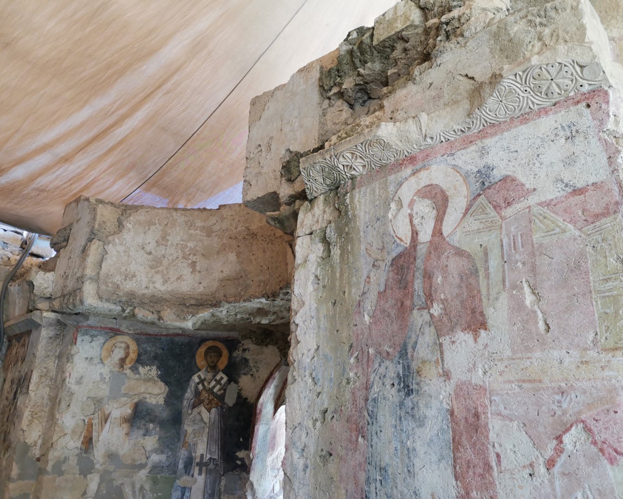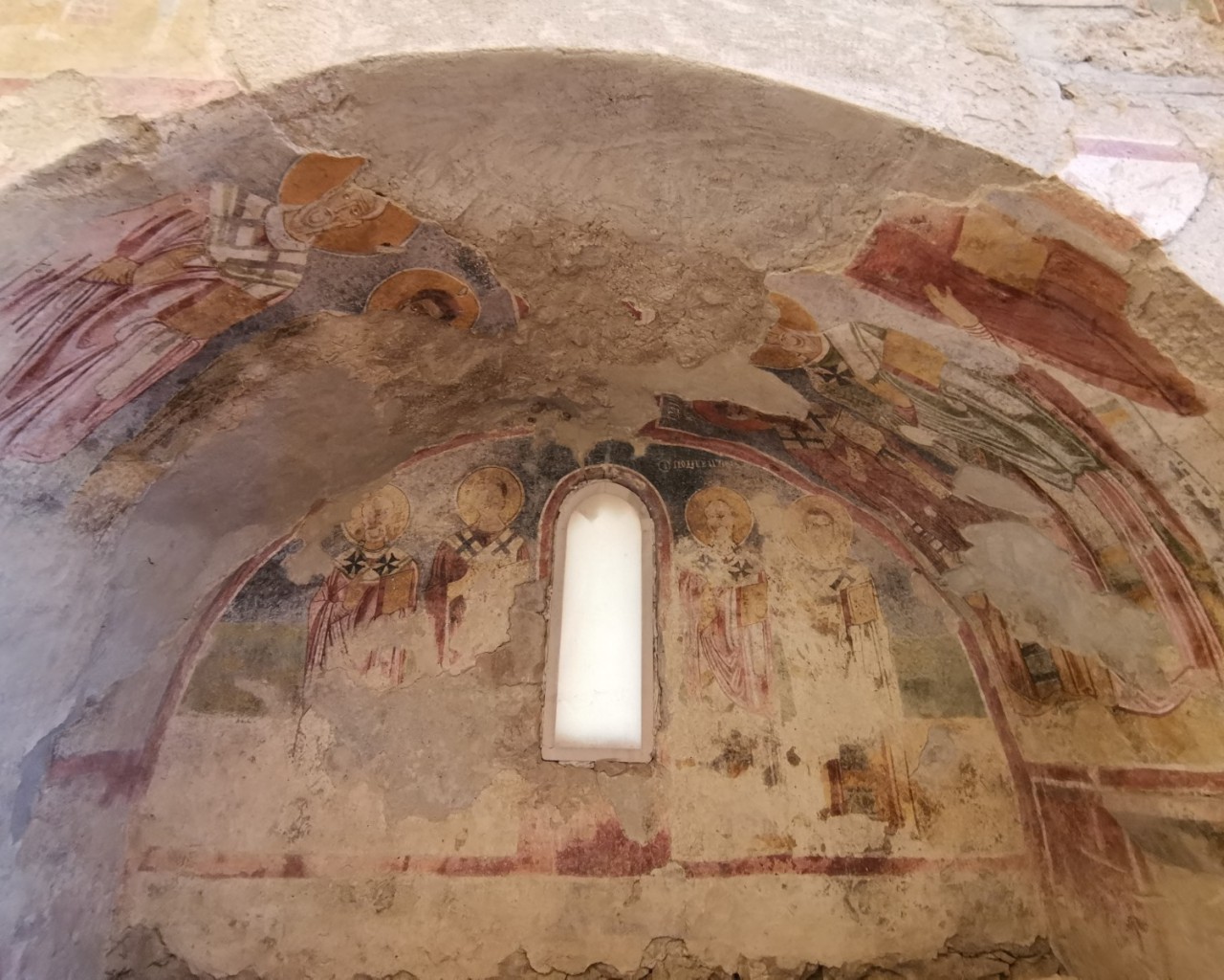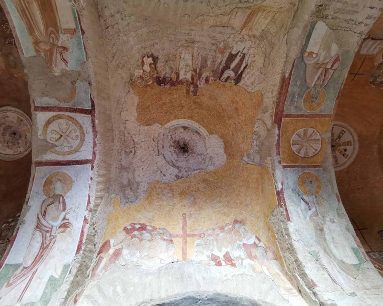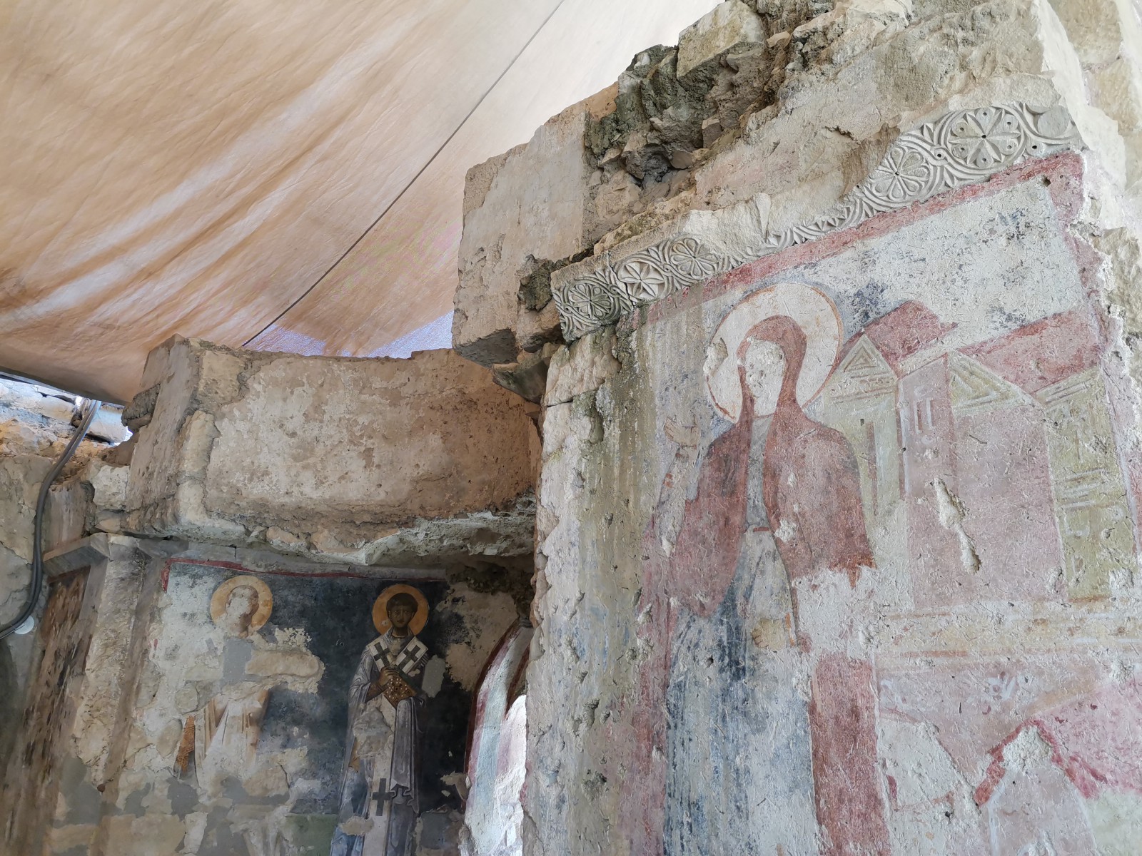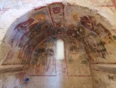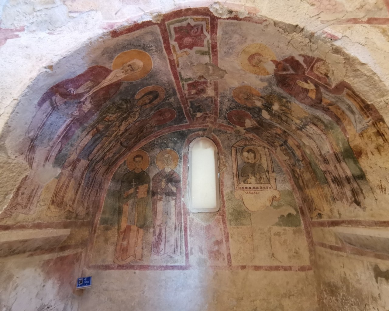 Перед входом в церковь расположены внутренний двор и двойной нартекс с крестово-вспарушенными сводами. Стены церкви были украшены фресками XI и XII веков, чьи фрагменты можно различить и сегодня, а пол был выложен мозаиками с геометрическими узорами. В полукруглой части центрального нефа находился синтронон с рядом мест для священников, кафедрой епископа и нижней галереей. Центральный неф отделён от боковых приделов сводчатыми галереями. Крышу церкви изначально венчал купол, во время реставрации заменённый сводом.