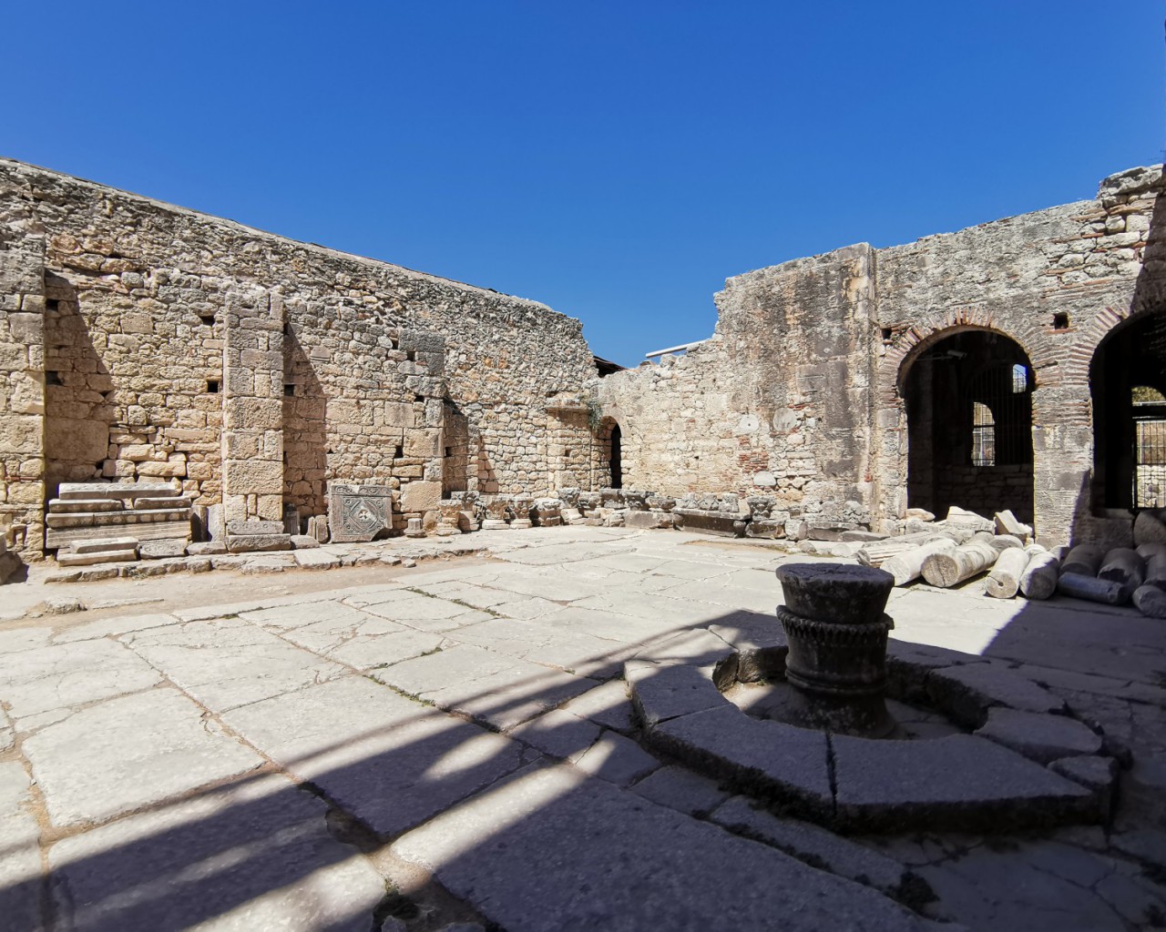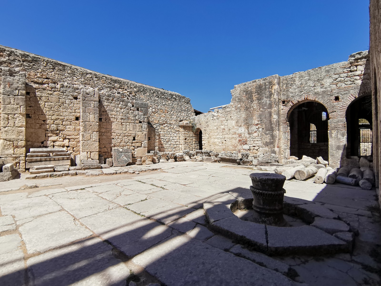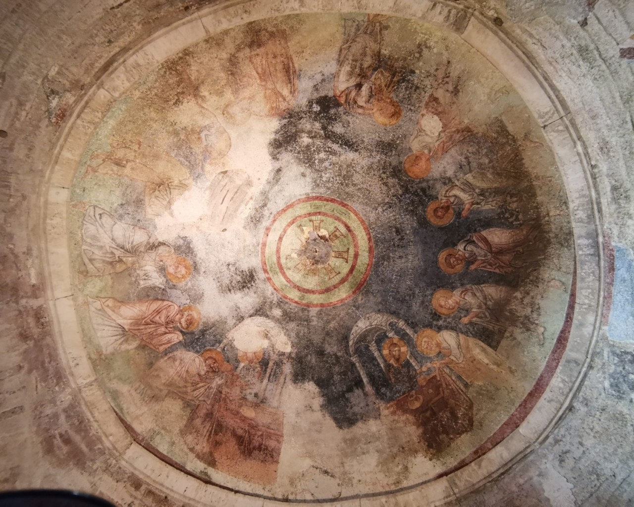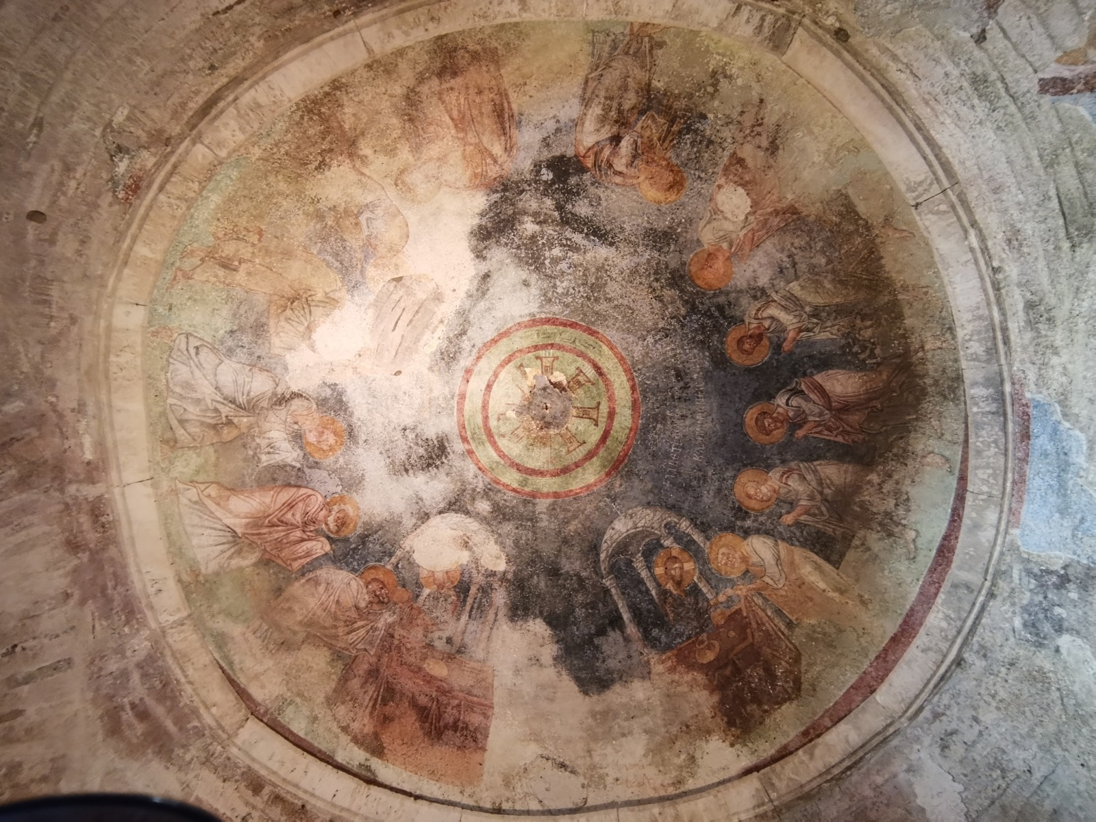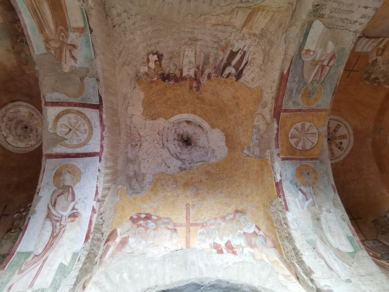 Перед входом в церковь расположены внутренний двор и двойной нартекс с крестово-вспарушенными сводами. Стены церкви были украшены фресками XI и XII веков, чьи фрагменты можно различить и сегодня, а пол был выложен мозаиками с геометрическими узорами. В полукруглой части центрального нефа находился синтронон с рядом мест для священников, кафедрой епископа и нижней галереей. Центральный неф отделён от боковых приделов сводчатыми галереями. Крышу церкви изначально венчал купол, во время реставрации заменённый сводом.