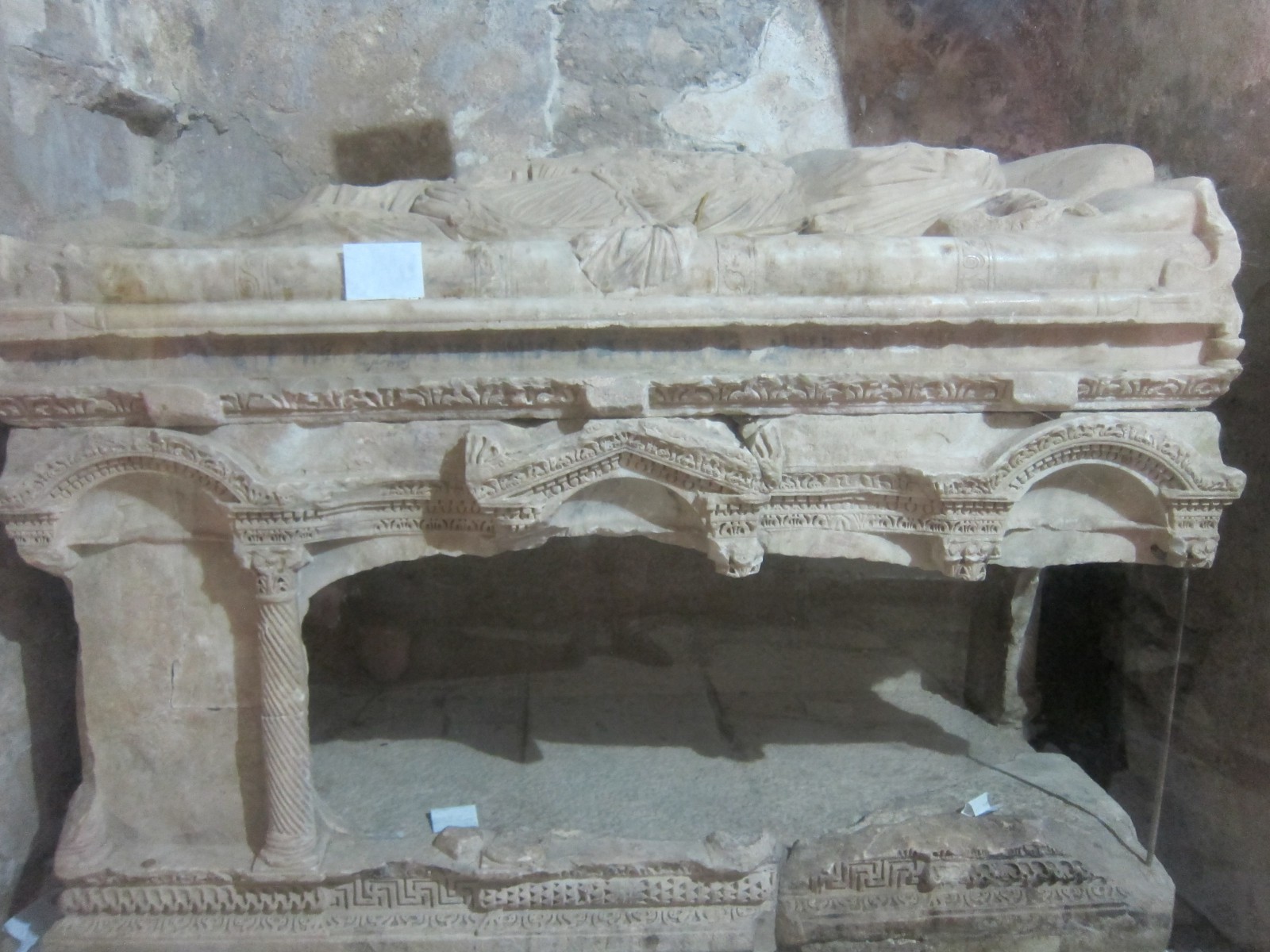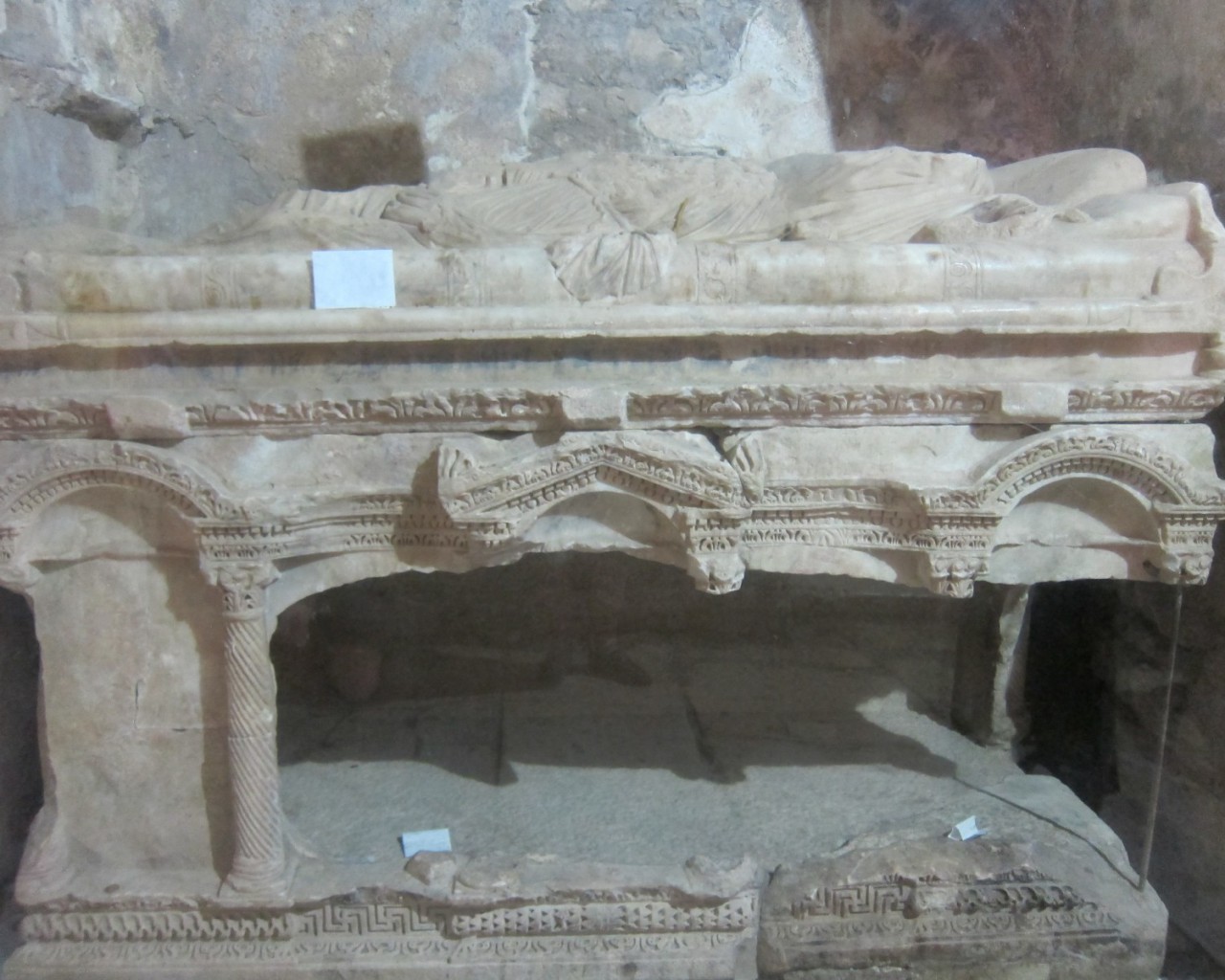 Саркофаг, в котором изначально находились мощи святителя Николая, находится в южном нефе церкви, расположенном между двумя колоннами позади разрушенной мраморной перегородки. В нем, как полагают, и был захоронен святой. Саркофаг изготовлен из белого мрамора, украшен различными рельефами и орнаментом с растительным узором.