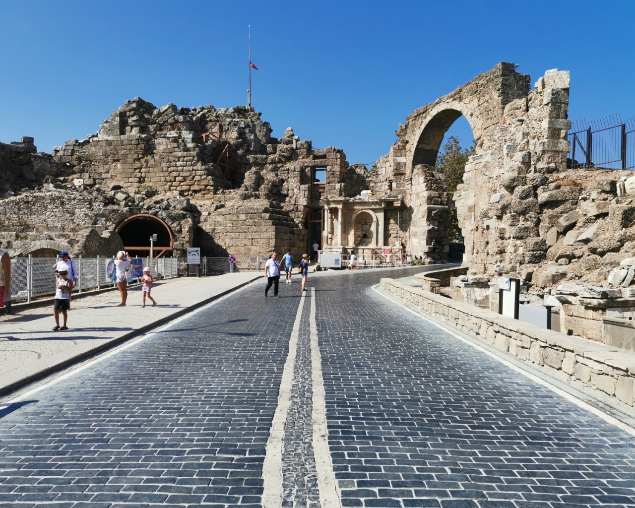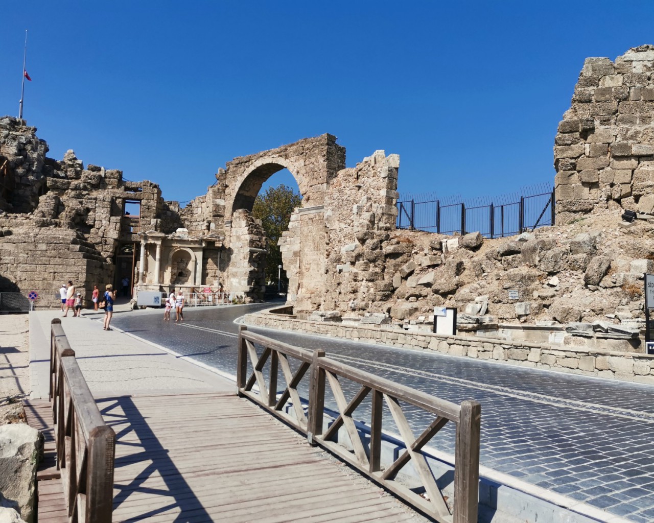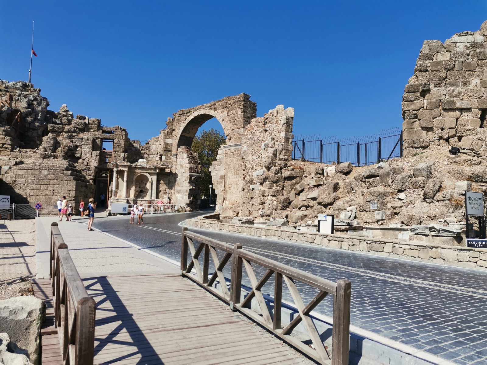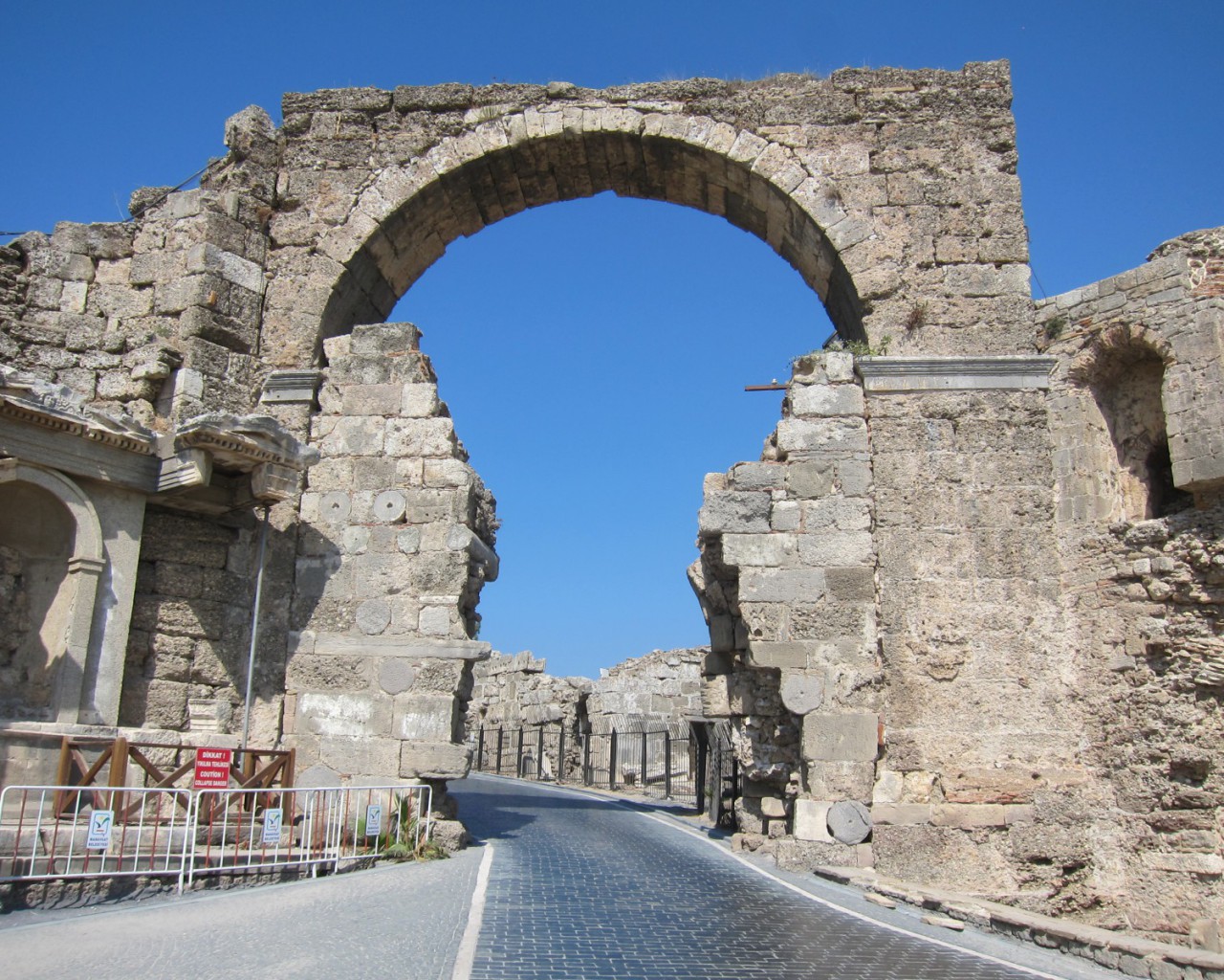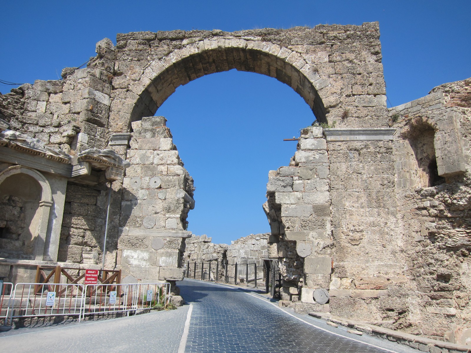 В 4 веке н.э. арка ворот была частично закрыта стеной, а в ней было оставлено меньшее отверстие, позволяющее добраться до города. Сделано это для защиты города от варваров. Тогда уже было не до красоты. Военная логика взяла свое. В настоящее время некоторые фрагменты этой стены все еще стоят, но ее часть была разрушена, чтобы облегчить вход в Сиде. Несмотря на это, что монументальные ворота по-прежнему являются узким местом местной улицы, особенно для входящих машин и пешеходов.