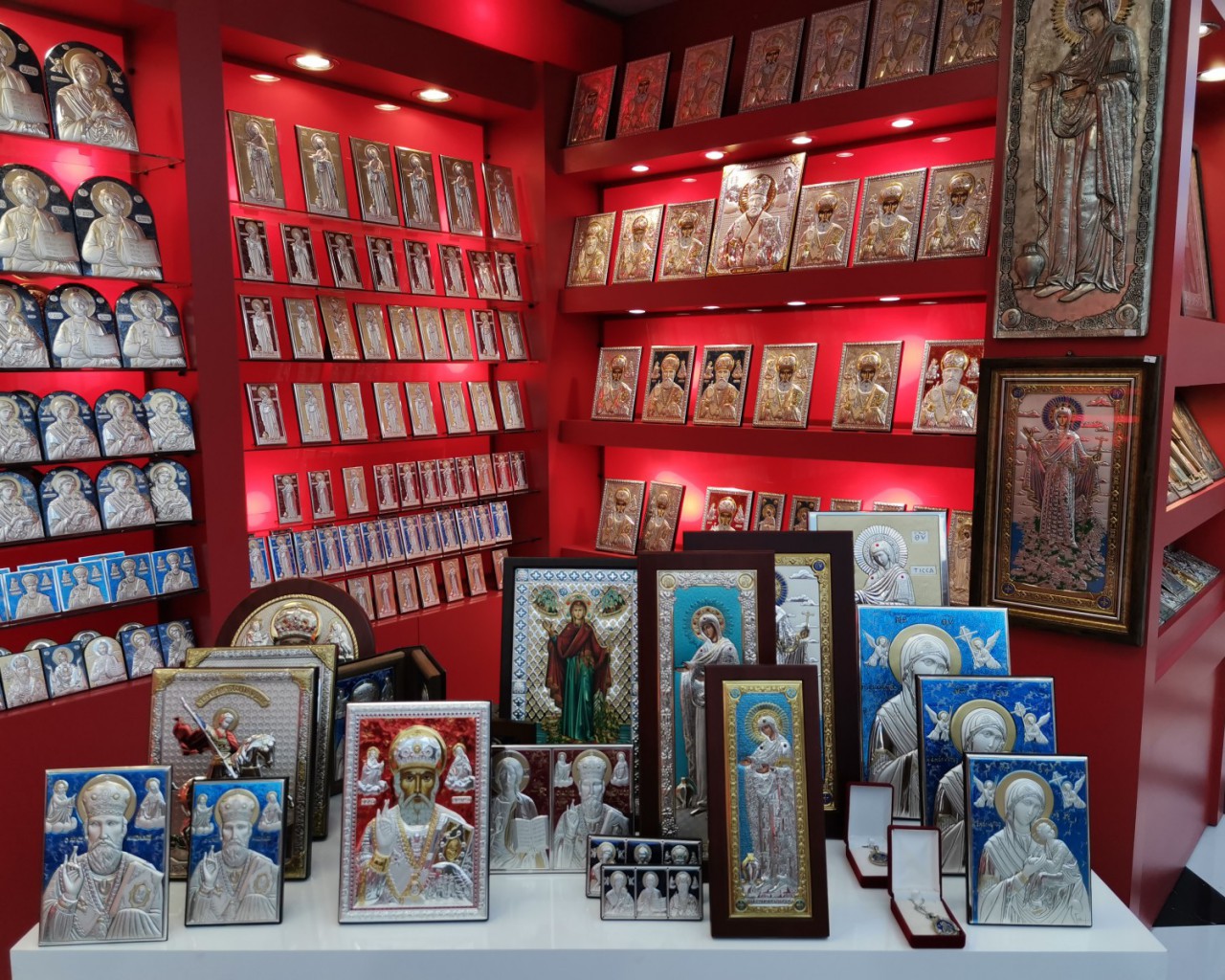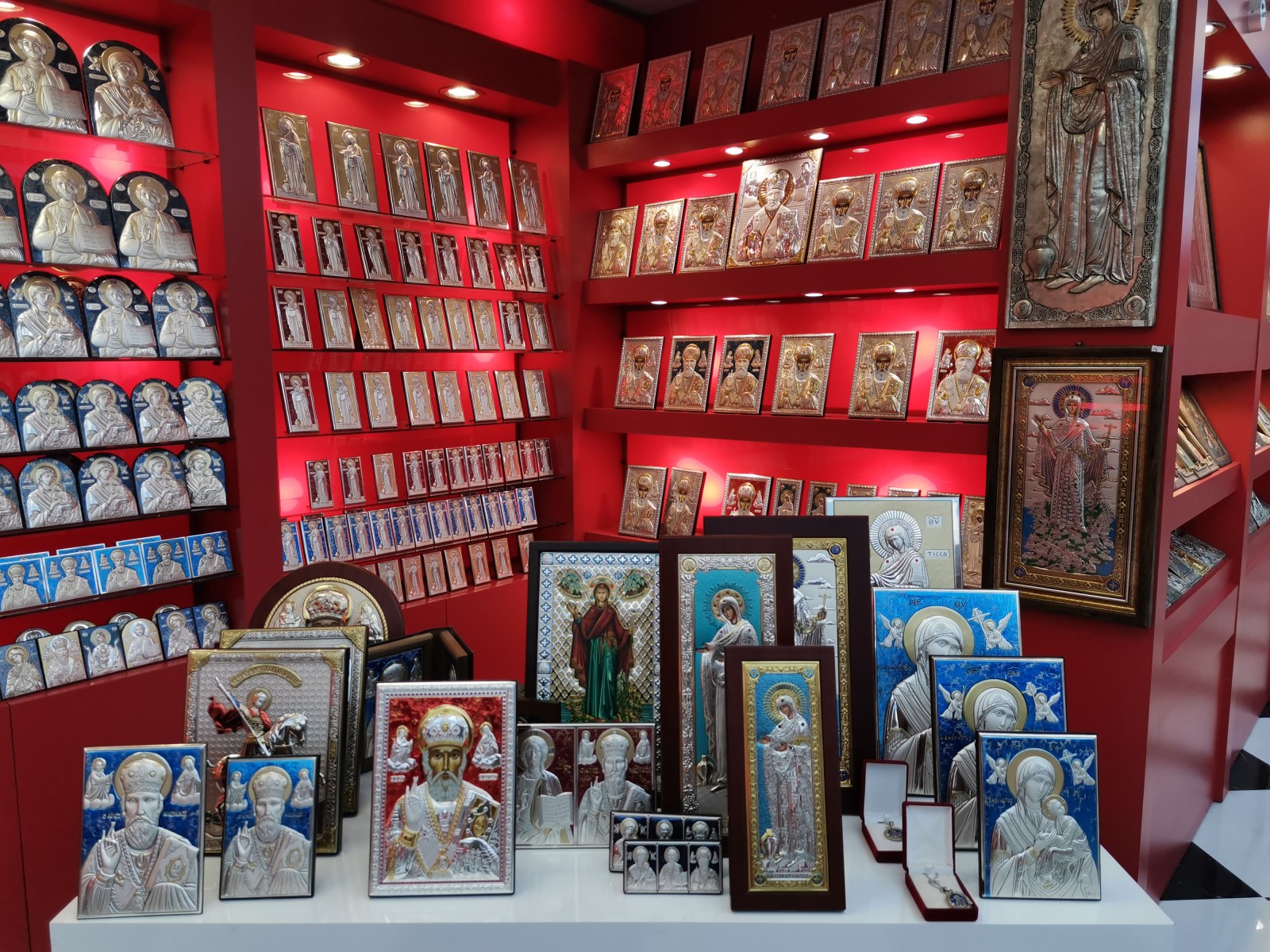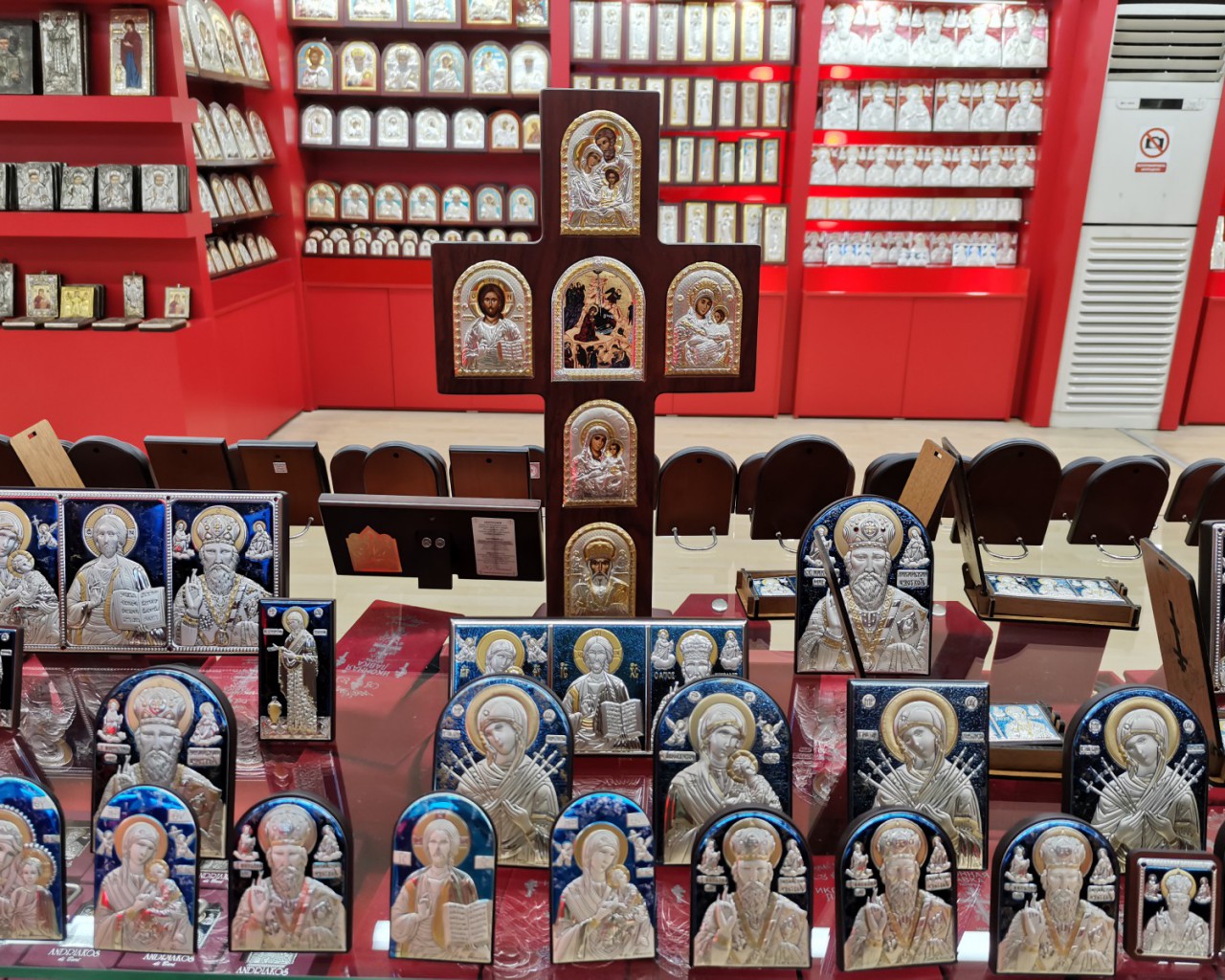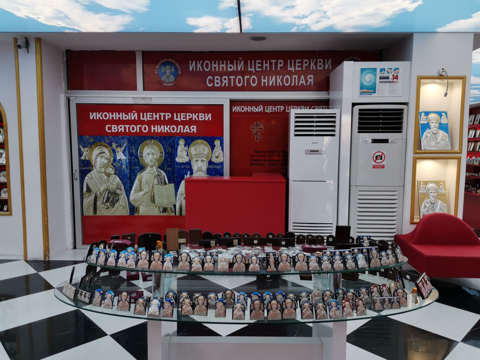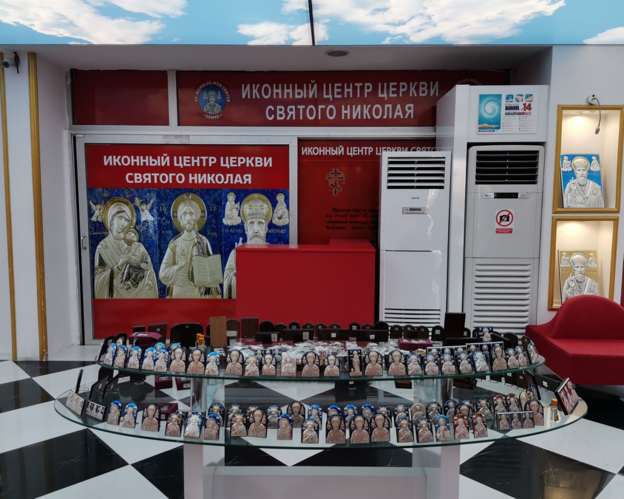 В иконном центре можно приобрести освященные иконы и другие религиозные атрибуты. Над входом в лавку установлена огромная вывеска на русском языке.