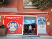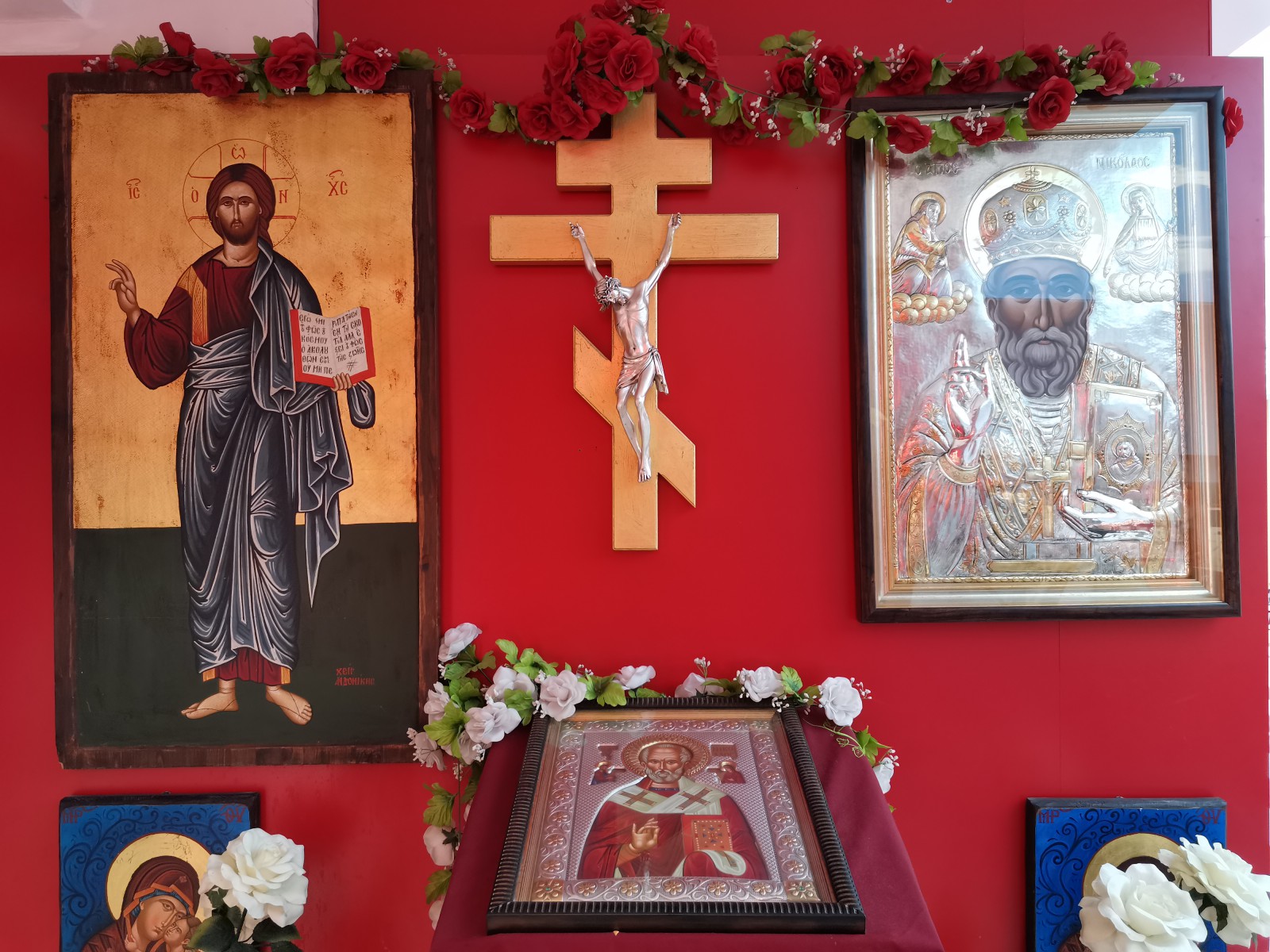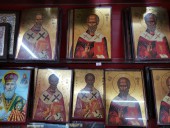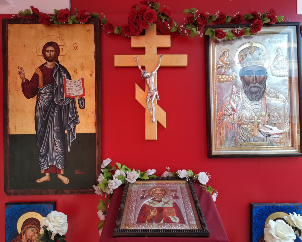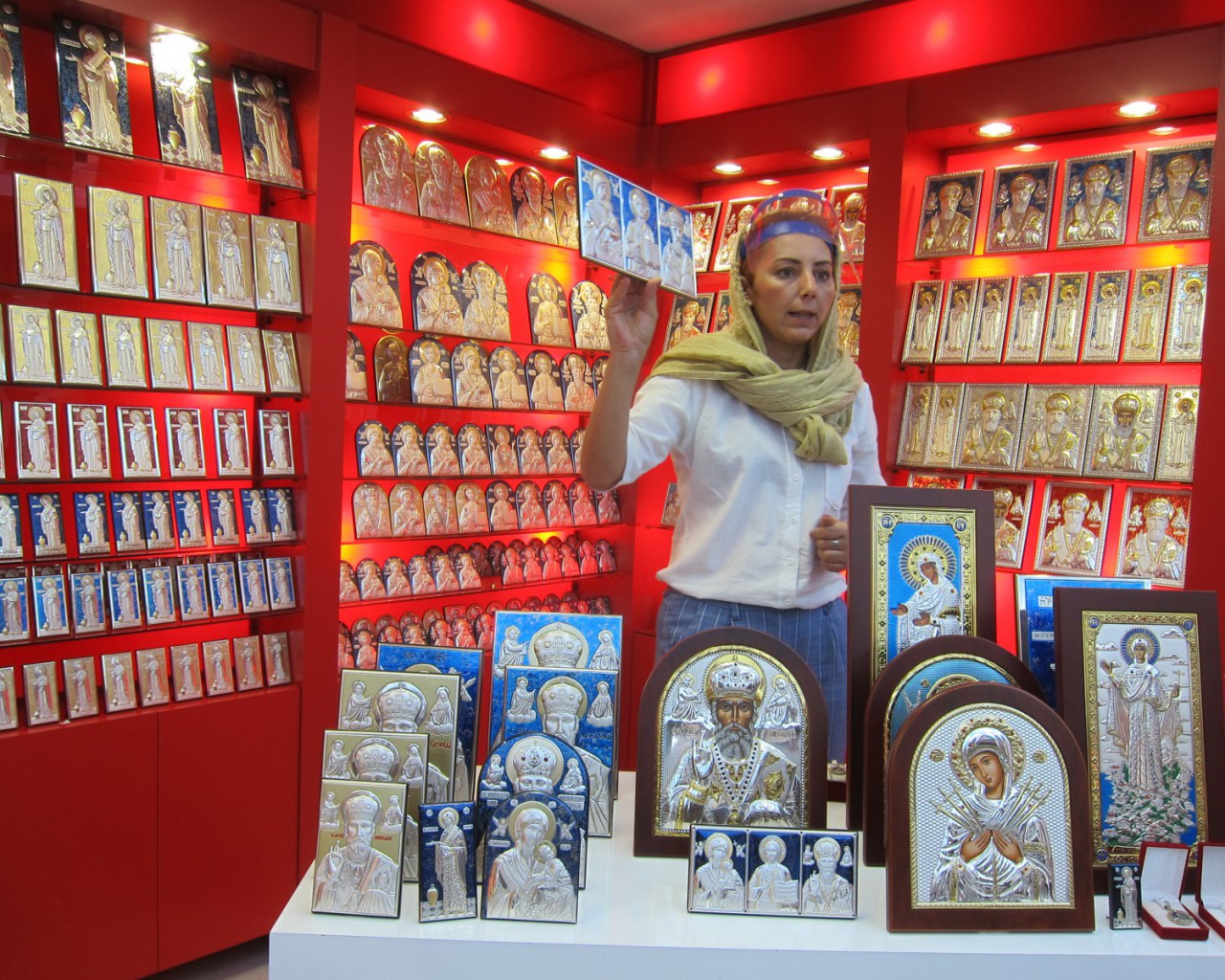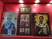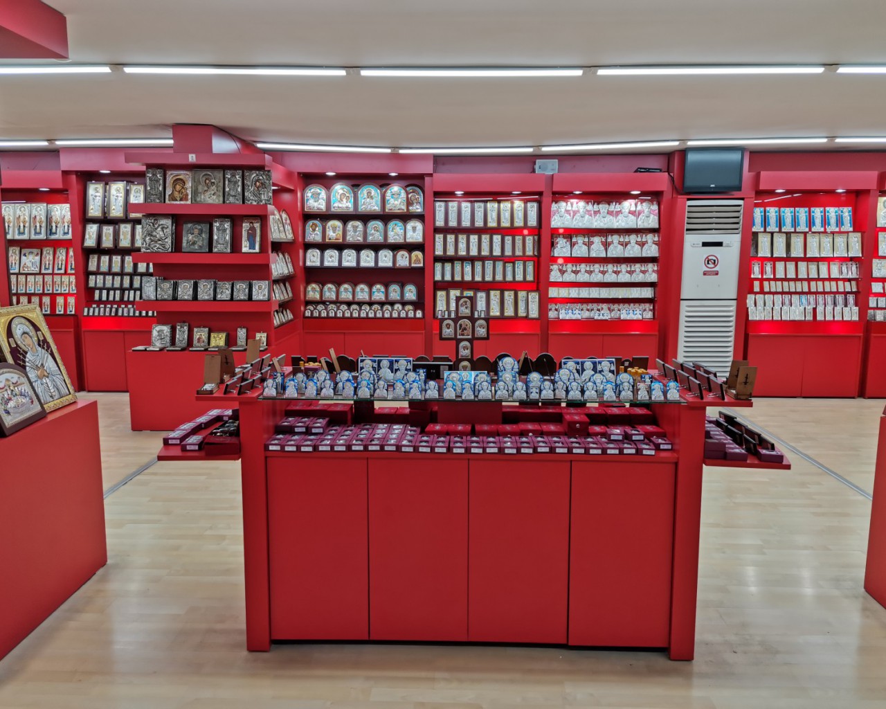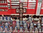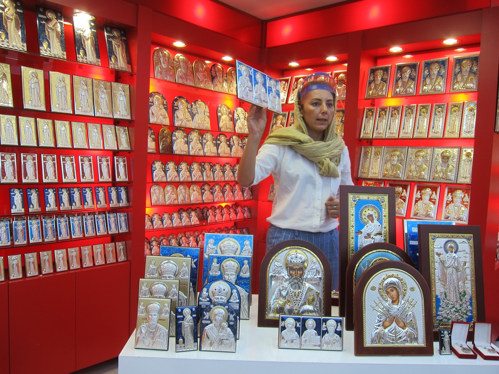 В иконном центре можно приобрести освященные иконы и другие религиозные атрибуты. Над входом в лавку установлена огромная вывеска на русском языке.