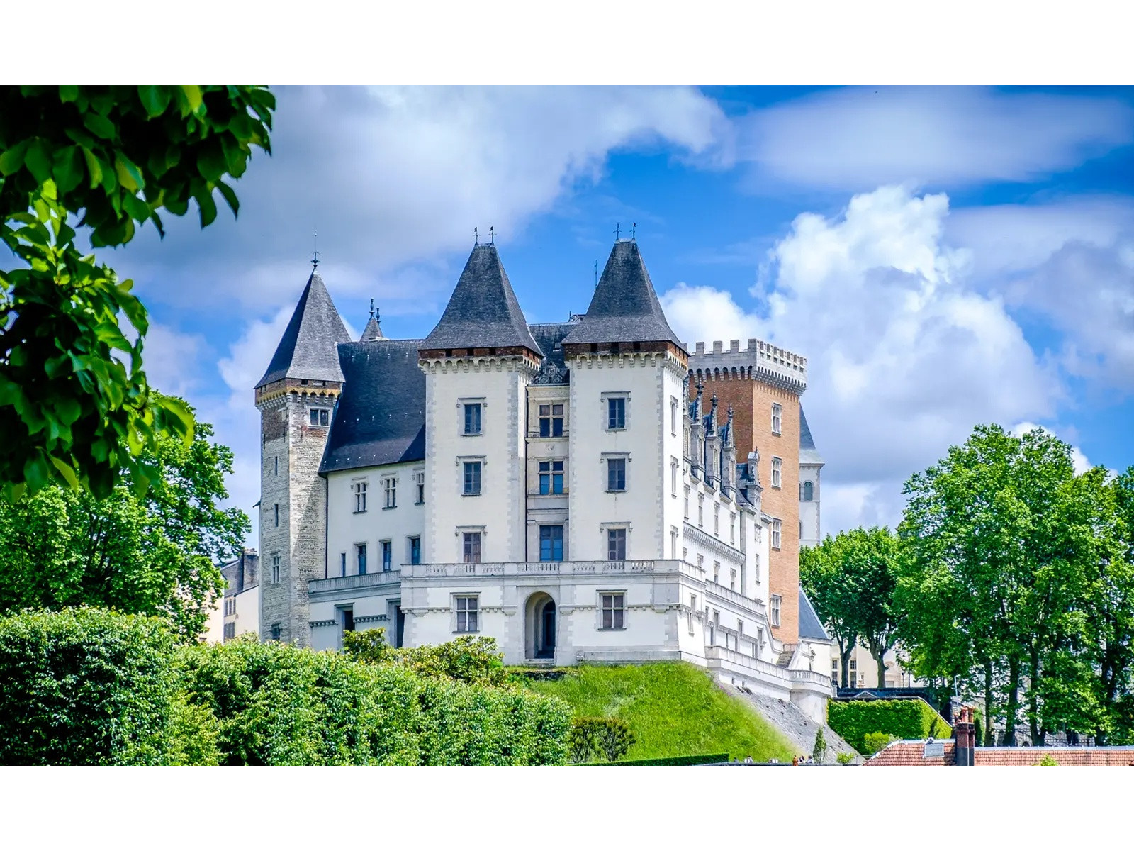 Существующие строения начал возводить Гастон III де Фуа, более известный под именем Гастон Феб. При нём был воздвигнут каменный донжон высотой 33 метра, на котором выгравировали надпись: «Febus me fe», означающую на местном наречии «Феб меня сделал». После испанского завоевания Наварры сменил в 1512 году замок в Олите в качестве основной резиденции наваррских королей и их двора, в связи с чем началась перестройка во вкусе Возрождения. В этом замке 13 декабря 1553 года появился на свет Генрих Наваррский — первый французский король из династии Бурбонов. В 1830-е последний король из этой династии, Луи Филипп, решив почтить память предка, распорядился украсить и заново обставить запущенную резиденцию. Масштабная реконструкция в духе романтизма была завершена уже в годы Третьей империи.