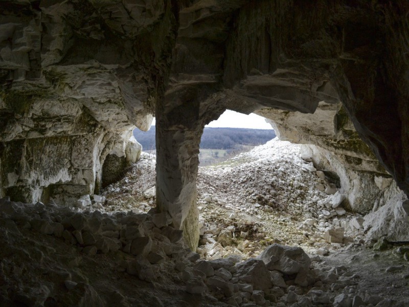 Широкая и плоская площадка на высоком холме. Красивая пещера и хорошо сохранившиеся окопы