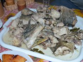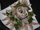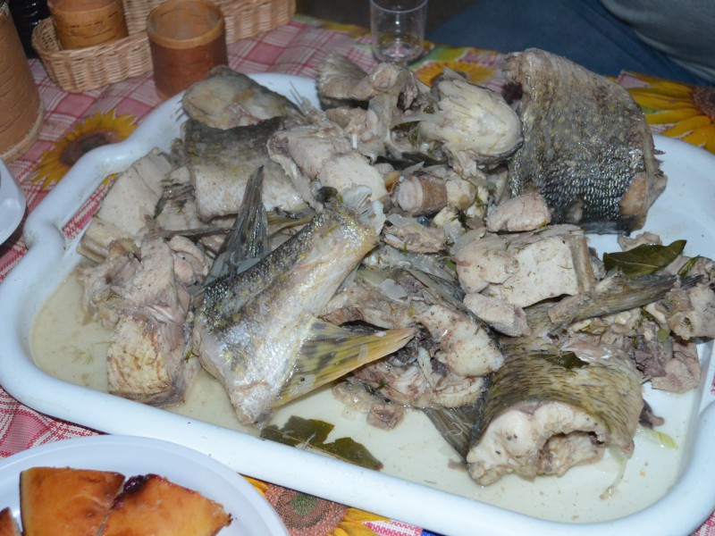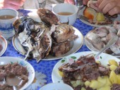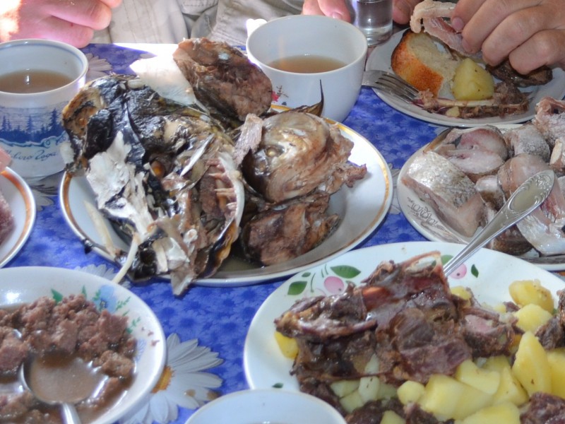 «Ужин Ермака» в ресторане «Таежный тупик». В меню: уха, блины с икрой, грузди, капуста с брусникой, картошка, муксун слабосоленый
