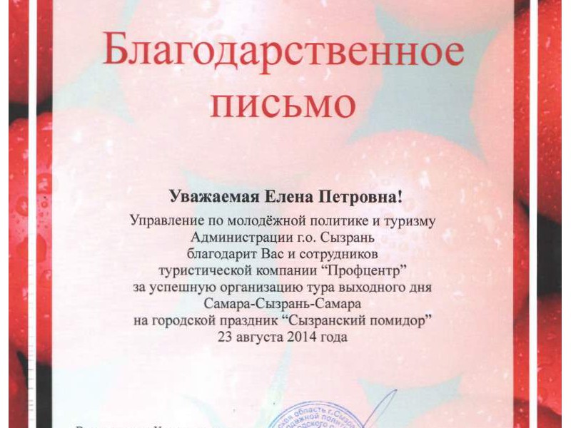 С 2012 года в третьи выходные августа туроператор "Профцентр" уже шесть лет подряд собирает уникальный массовый сборный маршрут на международный гастрономический фестиваль "Сызранский помидор" на специализированном туристическом поезде из Самары. Это регулярный РЕГИОНАЛЬНЫЙ гастрономический маршрут, в котором принимают участие каждый желающий от 1 человека. Общее количество участников данного маршрута ежегодно- от 250 чел. до 620 чел. одновременно. По количеству участников данного внутрирегионального железнодорожного маршрута ему нет аналогов в России.