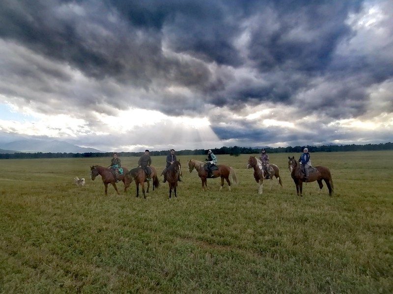 - После отдыха лошади седлаются и группа возвращается обратно к р. Железная в палаточный лагерь, ужин, отдых.