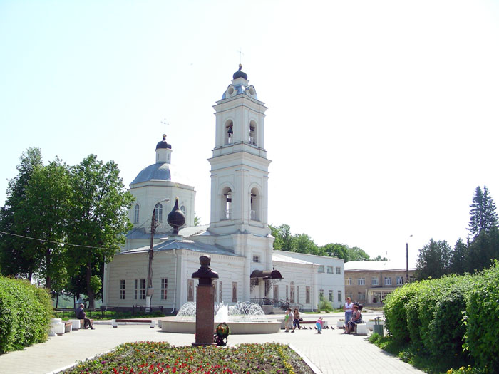 На площади, Каменный собор с колокольней построен в 1789 году на средства императрицы Екатерины II На белом здании, пристроенном к храму, загадочная, но прекрасная надпись: «Выбери родной край». В 1930-х годах купола Петропавловского собора и колокольня подверглись уничтожению. В здании собора размещался Дом пионеров. Прошло время и в 2005 году вновь зазвонил самый большой колокол собора, отлитый на пожертвования жителей Тарусы и Тарусского района. А рядом находится памятник В. И. Ленину. Он установлен в 1962 году. Автор памятника – скульптор Павел Иванович Бондаренко. Одно из известных произведений скульптора – воздвигнутый в Москве памятник космонавту Ю. Гагарину. Нарядный собор! А Ленин всюду - был и есть, в маленьких городах памятники вождям везде сохранились... И наверное так будет правильно. История России и в том и в другом случае. Что было, то было.