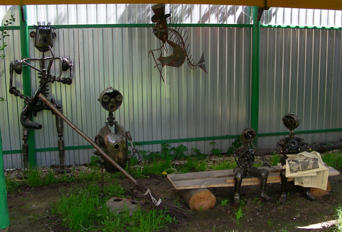 В нем совсем-совсем недавно открылся частный музей утюгов. Ну, мы москвичи понаехали, ясно дело – культур-мультур, надо сходить. А то как же непросвещенными-то назад поедем? Пошли и... в общем, не ожидали, да. Живет в этом доме мастер Сергей Жаров. Работает столяром, а в свободное время и для души варит из железа скульптурные штуки. Да еще какие. Вот Карлсон на входе. А я сначала даже и не поняла, из чего сделано. Оригинально, особенно два корпуса швейных машинок вместо ног, а голова – бензобачок. Какой симпатяга! Робомыслитель у входа в дом. Музыкант играет, ...а бабка тихо вяжет арматуру, рядом с ней еще дед сидит, газету читает. Евгений Онегин во дворе.