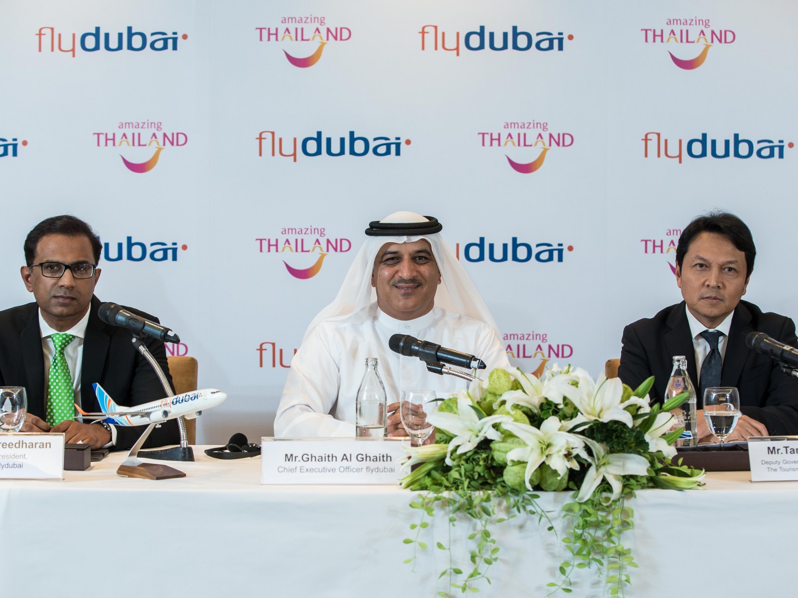 В ходе пресс-конференции, организованной Туристическим управлением Таиланда (Tourism Authority of Thailand, TAT), Судир Сридаран (Sudhir Sreedharan), старший вице-президент flydubai по коммерческим операциям в странах Залива, Африке и на Индийском Субконтиненте (GCC, Subcontinent and Africa), сказал: «Бангкок – одно из самых популярных туристических направлений в мире, предлагающих туристам большой выбор достопримечательностей и развлечений. Появление в сети flydubai такого важного направления, как Бангкок, свидетельствует о том, что мы не только предоставляем пассажирам из Дубая альтернативные варианты путешествия через Таиланд, но и соединяем Таиланд с Россией и Европой через Дубай. Так flydubai укрепляет позиции ОАЭ в качестве международного транспортного узла».